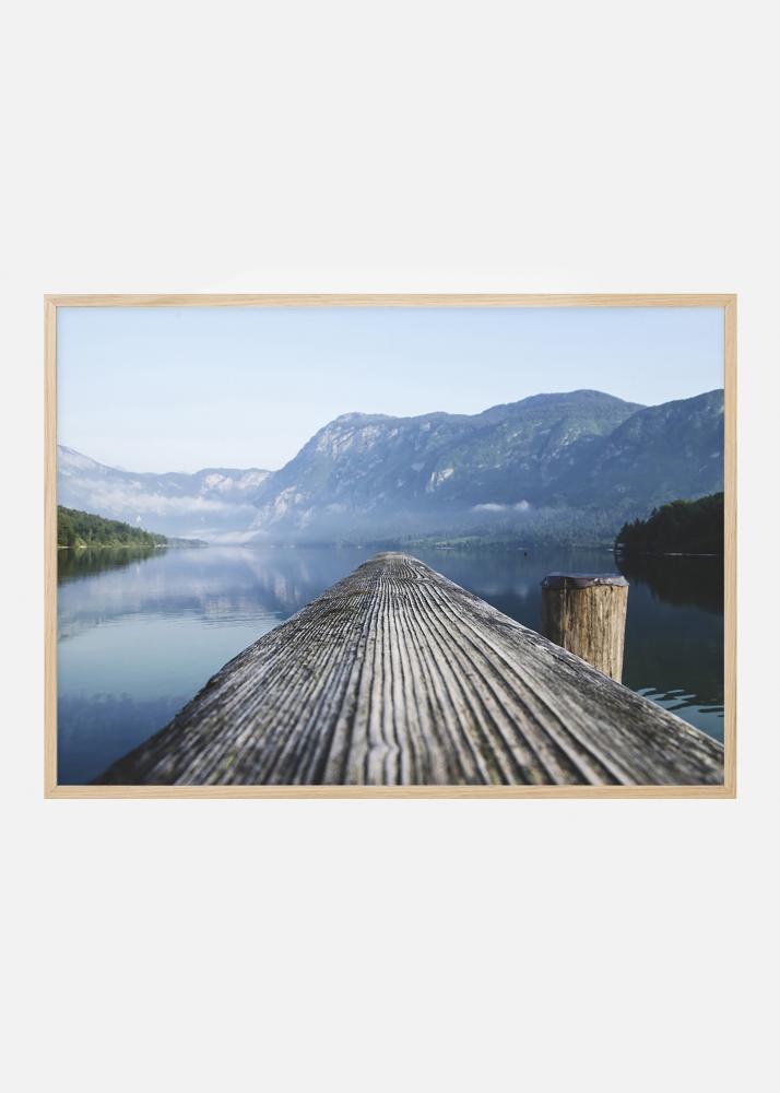 Uitzicht op een indrukwekkend fjordenlandschap vanaf een door weer en wind geteisterde steiger. Landschapsprint in blauwe tinten die net zo goed alleen aan de muur past als samen met maritieme accessoires of andere schilderijen. Complementeer met een grijze houten lijst om de kleuren in het schilderij te versterken, of een dunnere zwarte lijst voor een meer minimalistische uitdrukking.