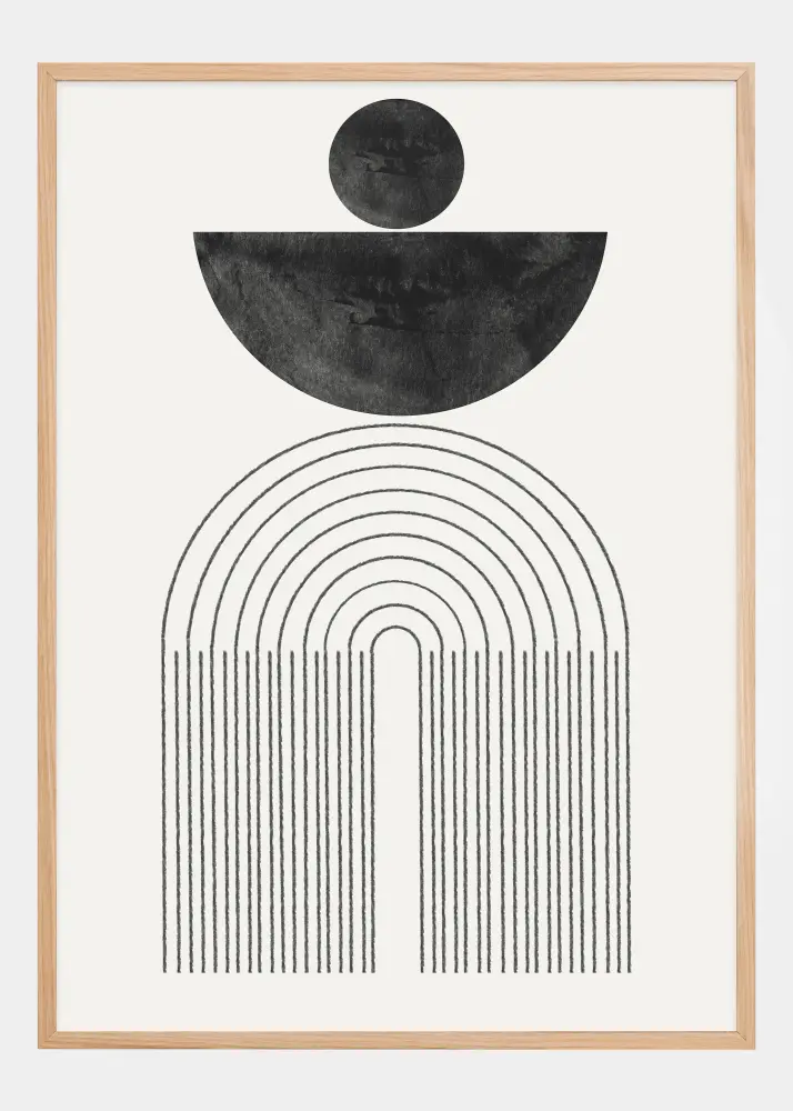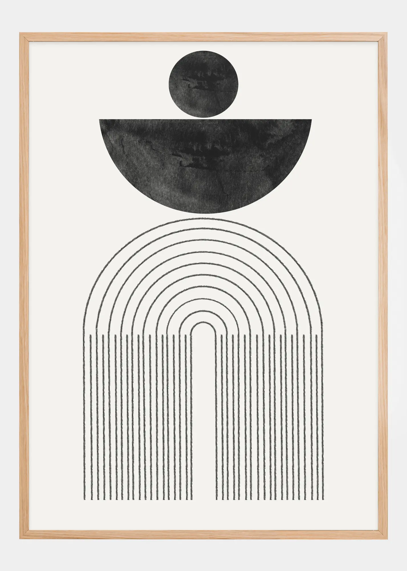 Deze gedurfde en suggestieve poster is een stijlvolle interpretatie van de maancycli en de harmonie van hemellichamen. De zwarte halve cirkel en de volle cirkel erboven illustreren de verschillende fasen van de maan, terwijl de golvende lijnen eronder lijken op architecturale zuilen of poorten naar een andere dimensie. Het zwart-wit contrast van het kunstwerk geeft een gevoel van elegantie en mystiek dat elke kamer verrijkt.