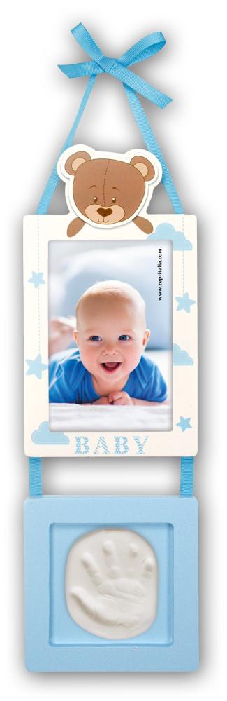 We hebben zelden zo'n schattig babyfotolijstje gezien. Dit schattige ontwerp bestaat uit een wit met blauwe fotolijst en uit een blauwe lijst waarin je een afdruk van een kinderhand of -voet kunt plaatsen. Het geheel wordt bij elkaar gehouden door een bijpassend satijnen lint met strik, hiermee kan de lijst ook worden opgehangen. Bovenop de witte lijst zit als versiering het hoofd van een teddybeer dat naar voren kijkt. Een setje met gips voor de hand- of voetafdruk is bijgeleverd.