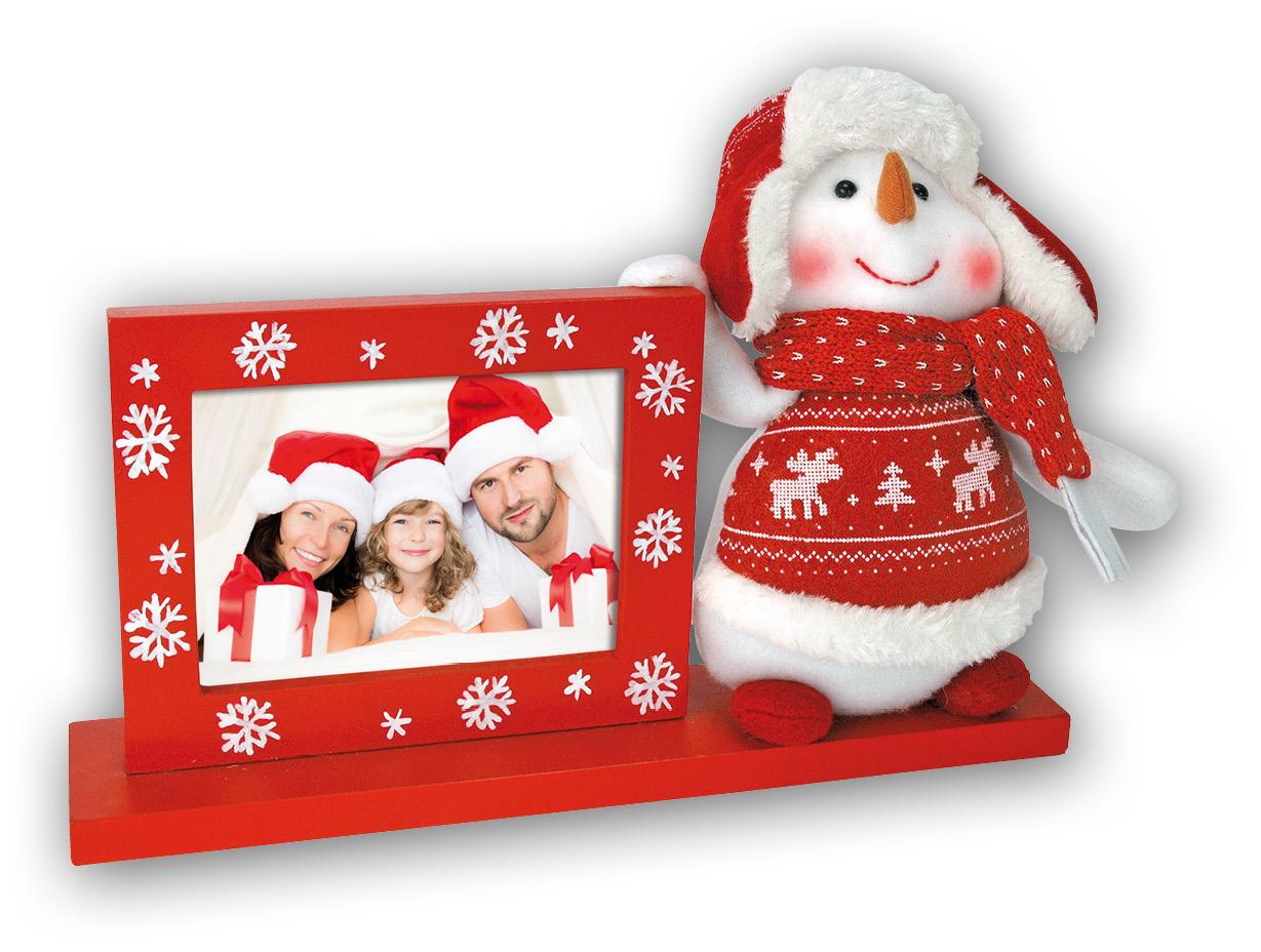 Een rode fotolijst versierd met sneeuwvlokken en een sneeuwpop. Heel geschikt om je foto's in kerstsfeer in te lijsten.