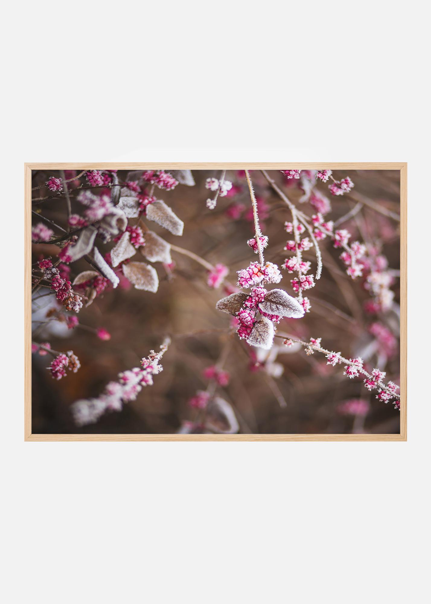 Fotokunst met close-up van rijp bedekte roze bessen met een kort scherptediepte. De print geeft met de bessen in roze en de achtergrond in chocoladetinten een warm en gezellig gevoel. In een grotere maat met een stijlvolle lijst wordt het schilderij een blikvanger in de woonkamer of plaats een kleinere variant in het fotocollage samen met andere posters in dezelfde kleurschakeringen.