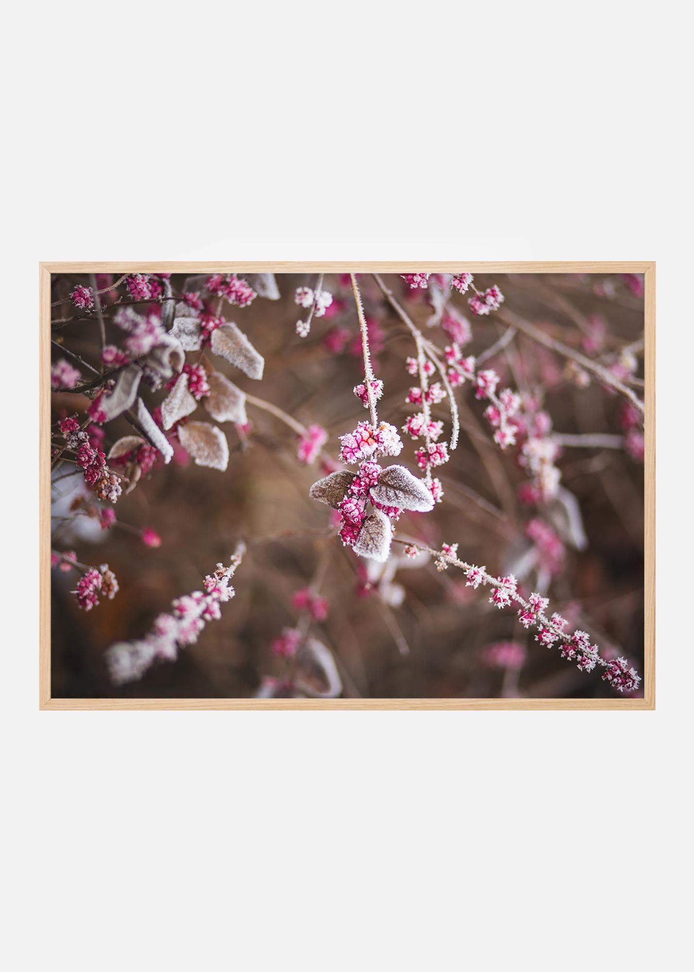 Fotokunst met close-up van rijpige, roze bessen met een kort scherptediepte. De print geeft met de bessen in roze en de achtergrond in chocoladetinten een warm en gezellig gevoel. In een grotere maat met een stijlvolle lijst wordt het schilderij een blikvanger in de woonkamer of plaats een kleinere variant in de fotocollage samen met andere posters in dezelfde kleurschakeringen.