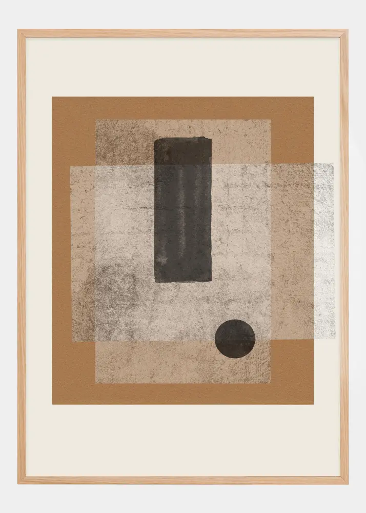 Deze poster is een eerbetoon aan de meester van de abstracte kunst, wiens werk speelde met vorm en textuur om balans en diepte te creëren. De overlappende rechthoeken in tinten van bruin, zwart en grijs creëren een gevoel van ruimte en dimensie, terwijl de eenzame cirkel een subtiele, maar krachtige, dynamiek aan de compositie toevoegt.