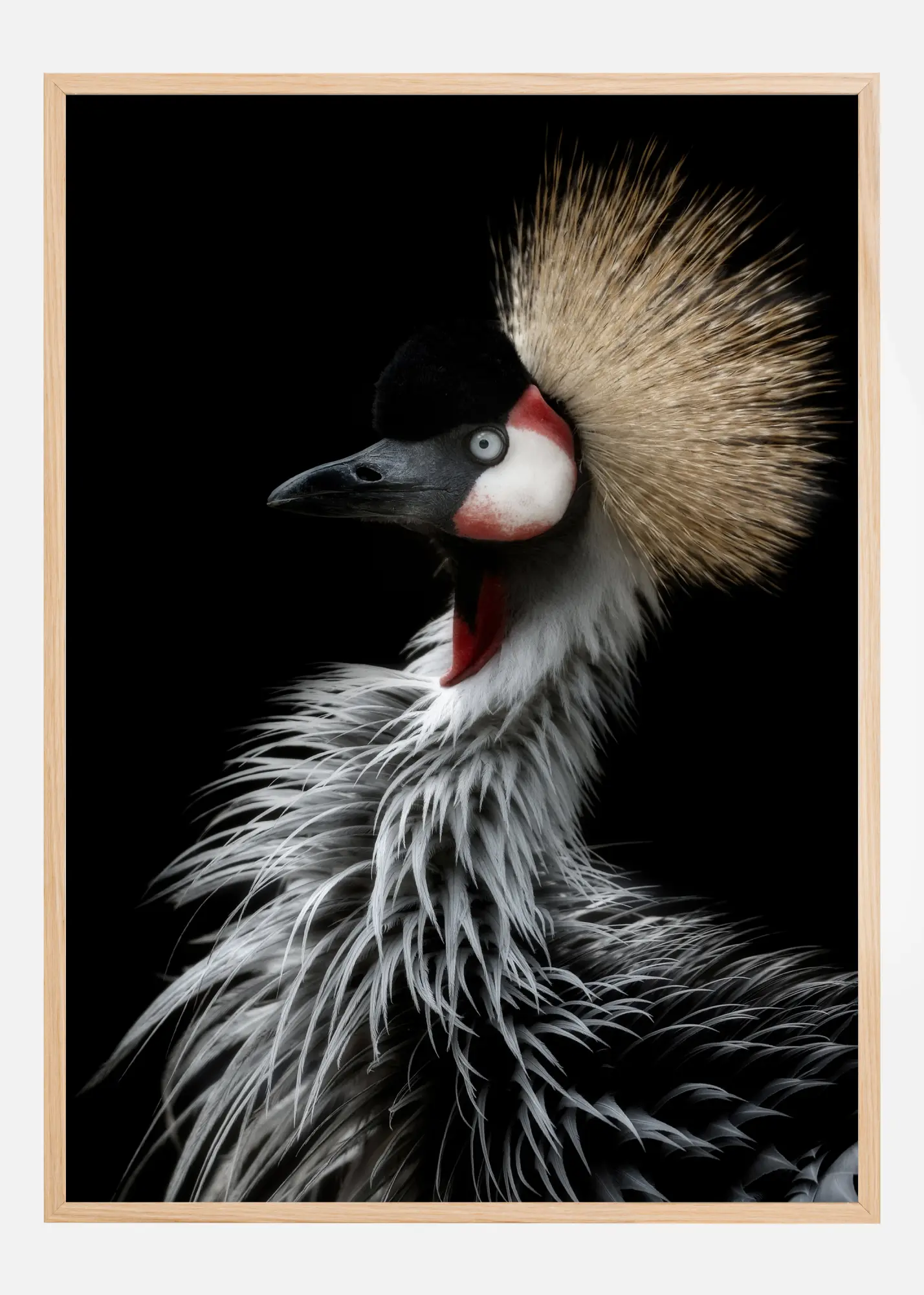 Een prachtige wildlife poster van een gekroonde kraanvogel op een zwarte achtergrond. De witte veren en de pluizige gele kuif komen dramatisch naar voren voor een vorstelijk effect. De rode en witte patronen trekken je aandacht naar het oog van de vogel. Bewonder de grootsheid van de wilde dieren in deze prachtige vogelposter.