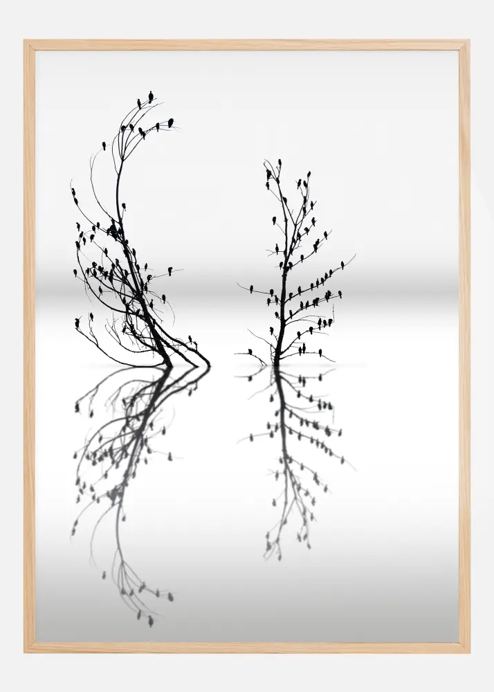 Een simplistische poster van twee takken die uit het water omhoog reiken. De donkere takken buigen en draaien, en weerspiegelen in het stille water eronder. De zachte blauwe en witte tinten in deze poster geven een sfeer van rust waarvan je geniet.