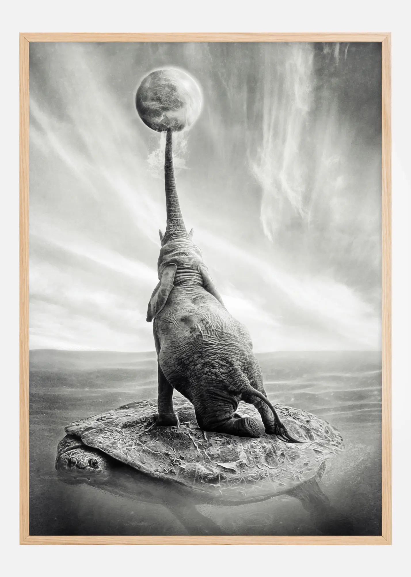 Deze fascinerende zwart-witte poster vangt een surrealistisch beeld van een olifant die op een schildpad staat en een wereldbol balanceert op zijn slurf. Het beeld straalt krachtige symboliek uit en speelt met elementen van mythologie en fantasie. De getextureerde huid van de olifant en schildpad, gedetailleerd en prominent, geeft een bijna tastbare dimensie aan het werk, terwijl de wazige achtergrond van wolken en landschap bijdraagt aan een dromerige en etherische sfeer.