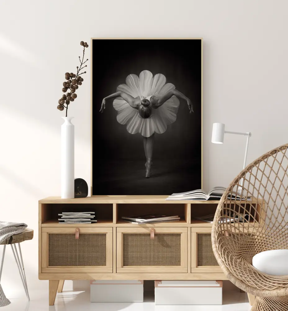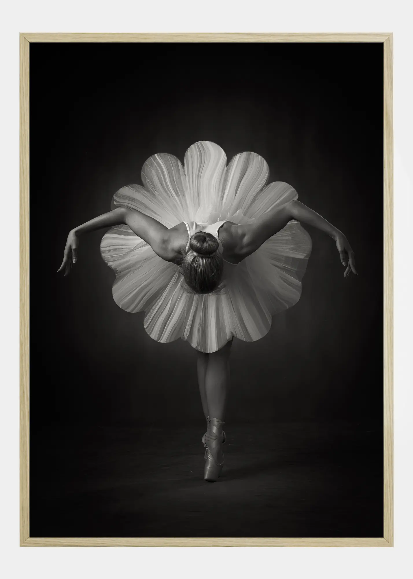 Een elegante poster van een balletdanseres met een bloemrijke rok. Deze prachtige poster zal discussie uitlokken over zijn abstracte aard en een gevoel van verwondering in je huis brengen.