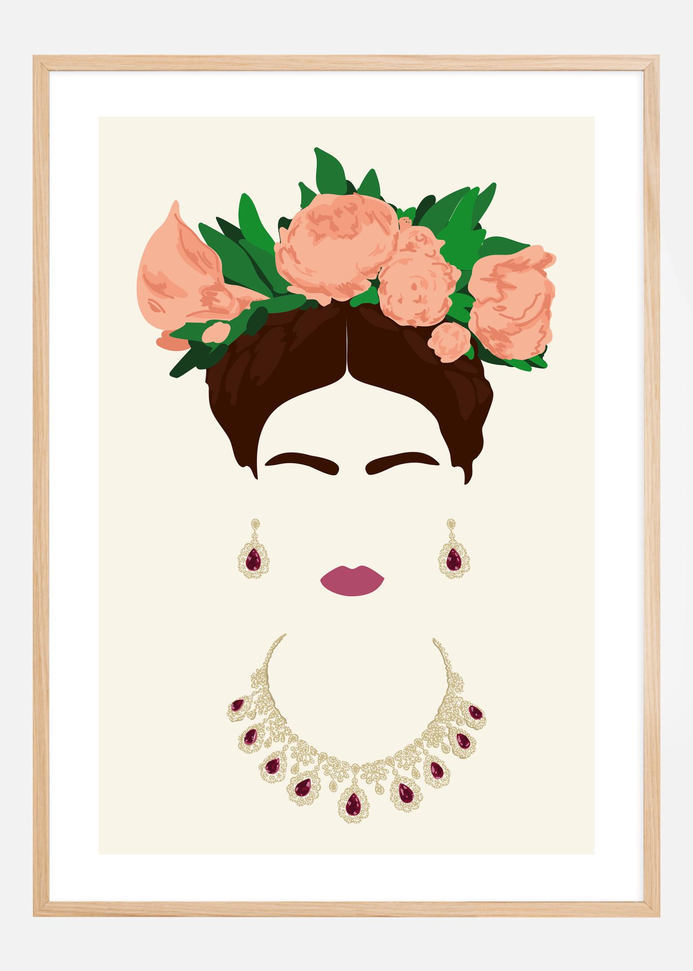 Deze opmerkelijke poster beeldt een gestileerde vrouwenfiguur af, versierd met een rijke flora en elegante juwelen. Het motief toont een harmonieuze samenstelling van donkerbruin haar, crèmekleurige huid en een stralende krans van koraalroze bloemen, aangevuld met donkergroene bladeren. Haar gelaatskenmerken zijn gereduceerd tot minimalistische vormen, wat een moderne uitstraling geeft.
