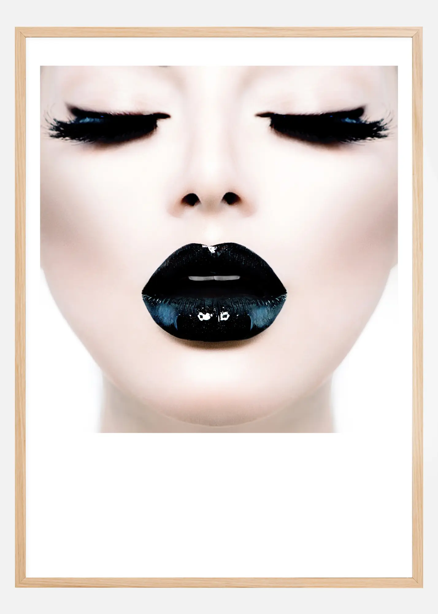 Een heerlijk opvallende fotokunstposter binnen het thema mode! Hier ontmoeten zwarte volle lippen en dikke zwarte wimpers een porseleinwitte huid en een witte achtergrond. Een stijlvolle en contrastrijke poster, makkelijk te combineren met andere favorieten op een grotere schilderijenmuur.