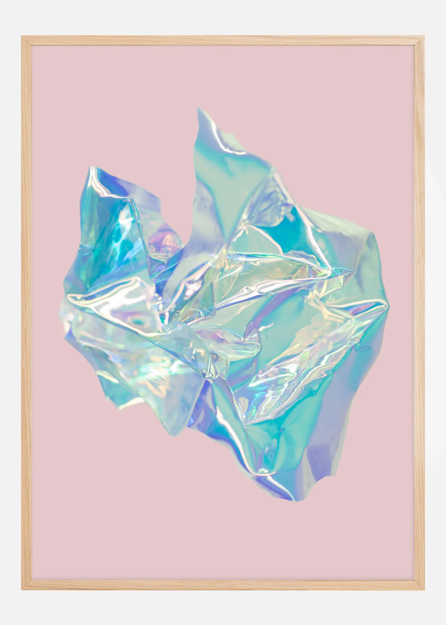 Deze poster is een eerbetoon aan het hedendaagse en experimentele, waar een gekrulde holografische folie zweeft tegen een zachte roze achtergrond. De reflecterende oppervlakken glinsteren in een spectrum van pastelkleuren die variëren van aquamarijnblauw tot zacht lavendel en roze-achtig roze. Deze print is een perfecte metafoor voor flexibiliteit en verandering, en past uitstekend in een modern interieur dat unieke, tot nadenken stemmende details waardeert.