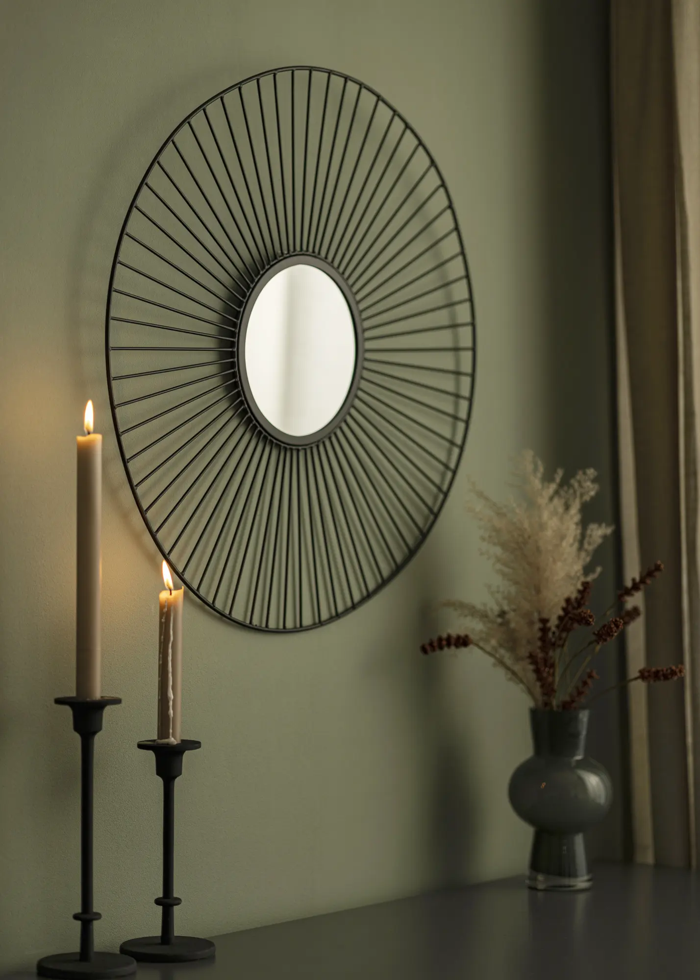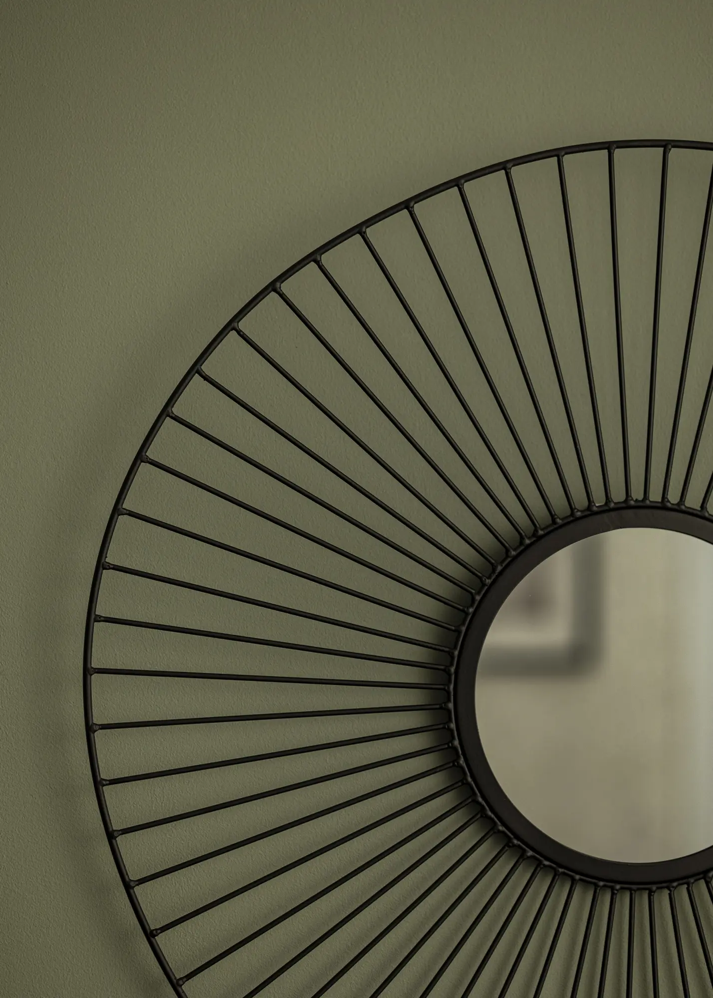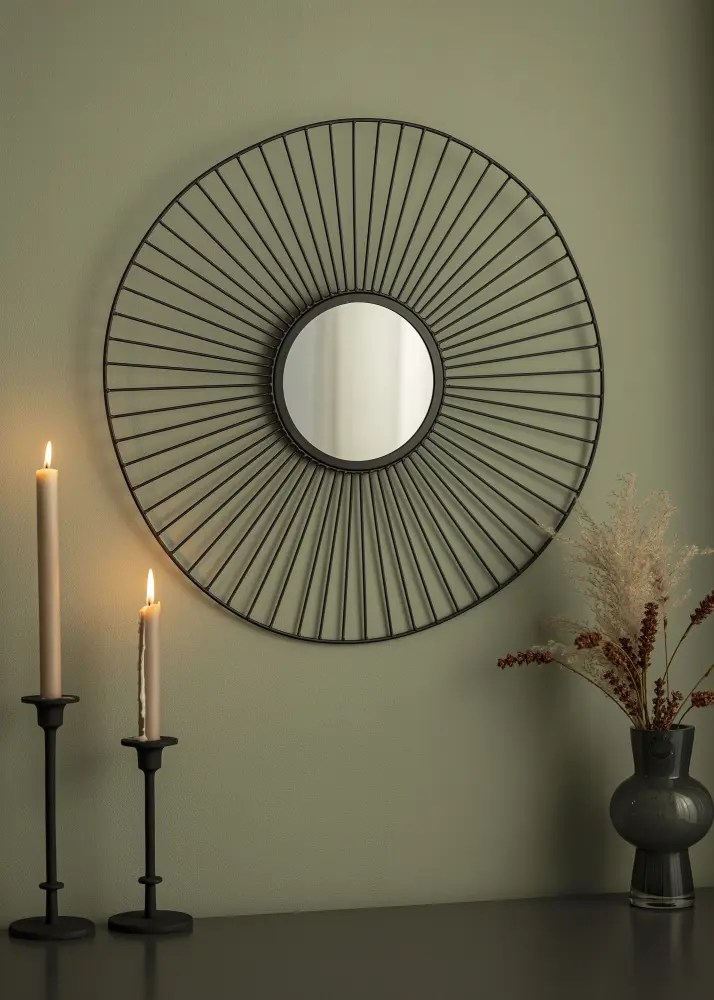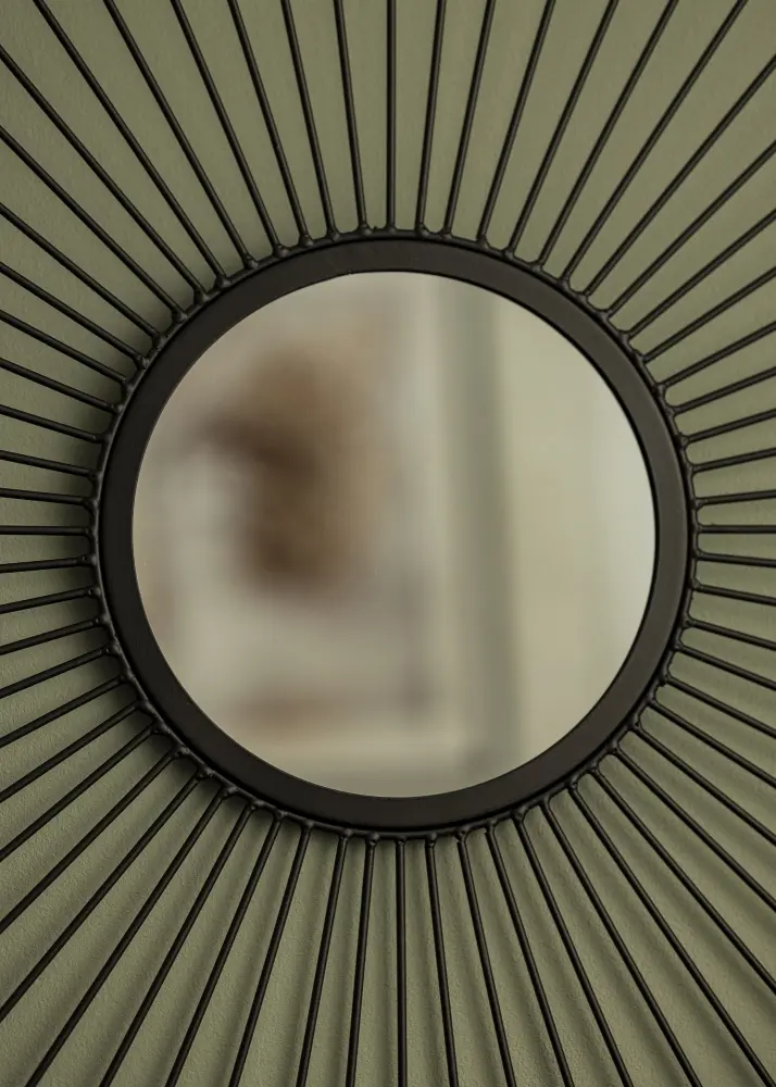 Dit is een opvallende wandspiegel van KAILA in stijlvol en uniek design. Een kleinere spiegel in het midden wordt omcirkeld door een mooi frame met dunne metalen staven in het zwart. De buitenmaten van de spiegel meet 60 cm Ø. Wandbevestiging is aanwezig. De spiegel heeft een moderne zwarte kleur. Plaats deze spiegel ergens in huis waar hij tot zijn decoratieve recht kan komen. Waarom combineer je het niet met stijlvolle schilderijen in een fotowand?