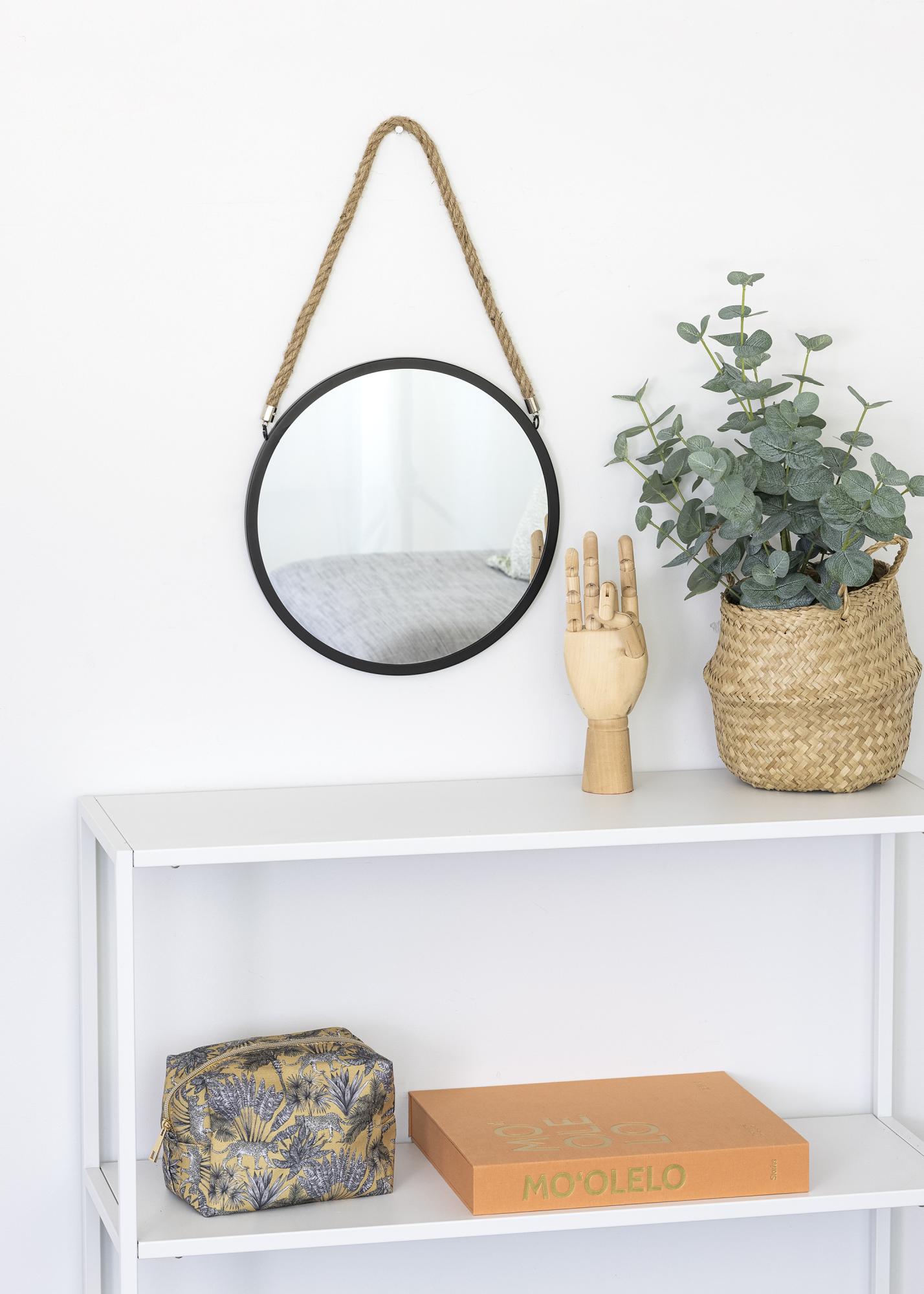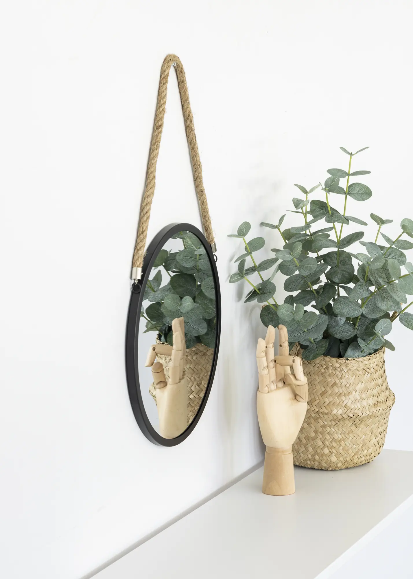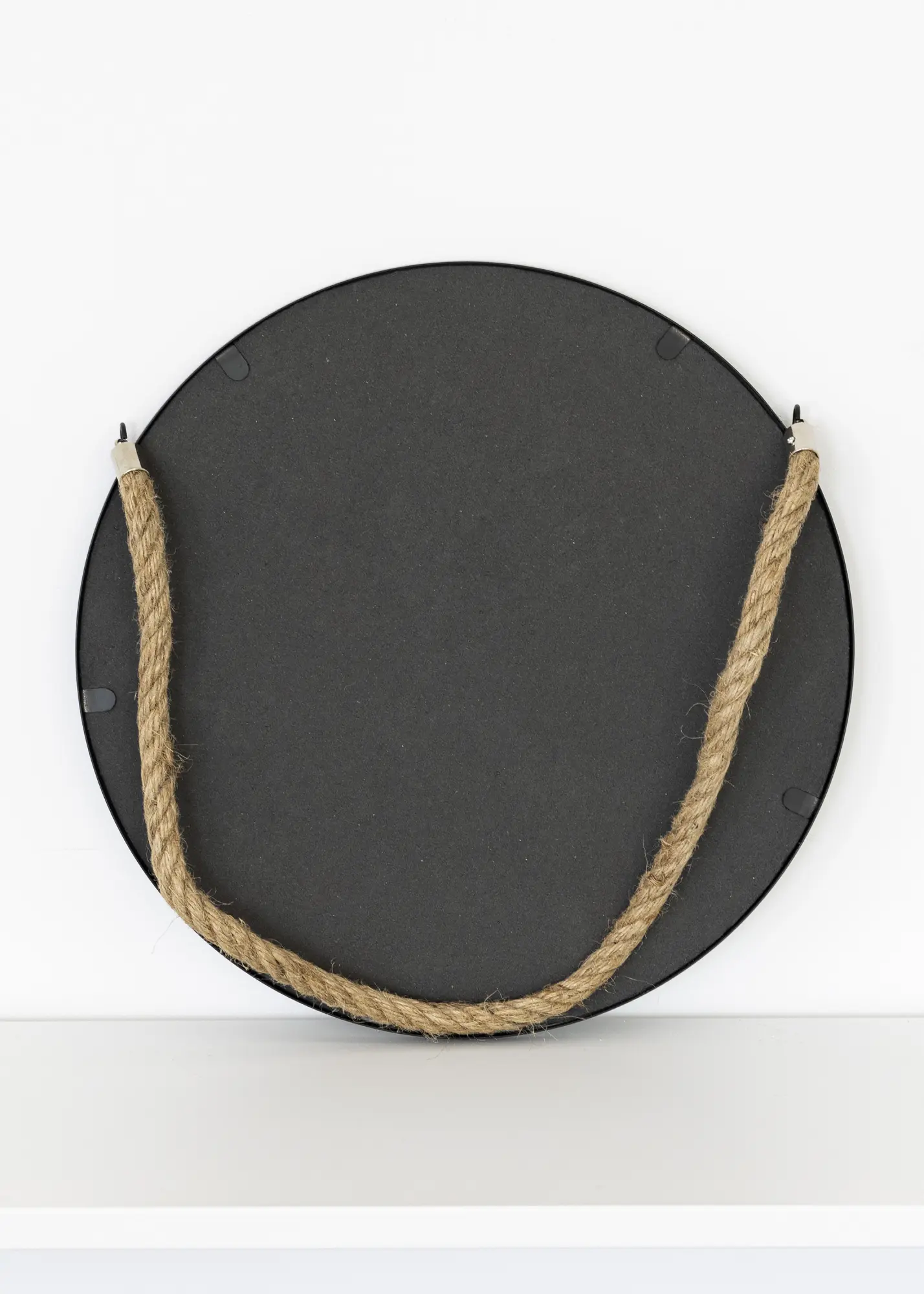 Hier is een ronde wandspiegel perfect voor degenen die worden aangetrokken door een marine geïnspireerd interieur! De spiegel is gemaakt van metaal en heeft een decoratief henneptouw voor een mooie ophanging. Muurbevestiging is aanwezig. Het glas van de spiegel wordt omlijst door een zwarte rand die de spiegel een stijlvolle diepte geeft. De spiegel heeft een diameter van 30 cm.