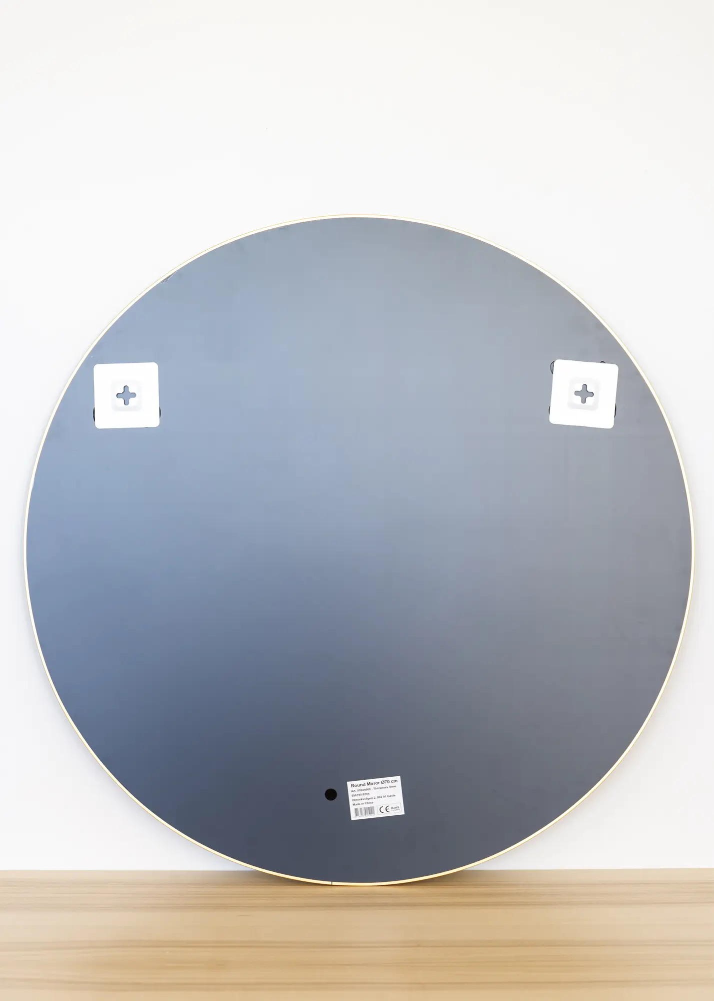 Deze ronde spiegel is verkrijgbaar in verschillende maten, waarvan deze variant een diameter heeft van 70 cm. De spiegel heeft wandbevestigingen.