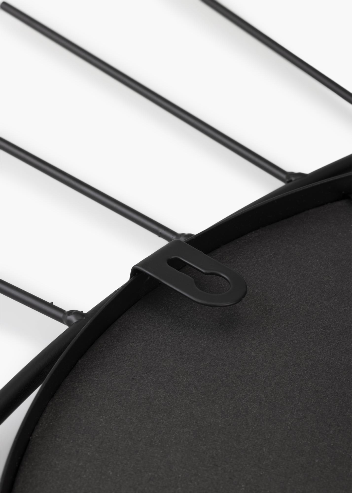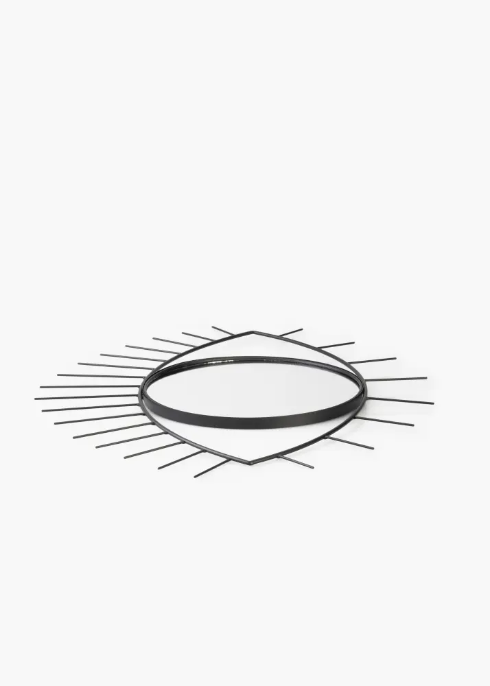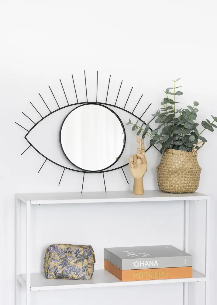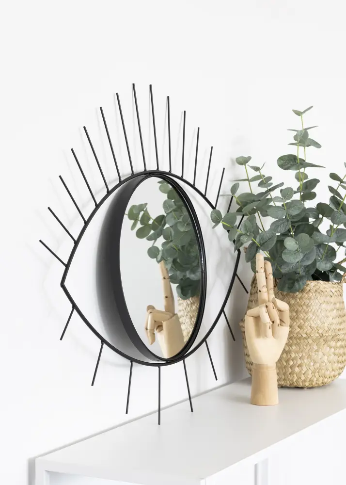Dit is een wandspiegel in een uniek ontwerp dat de aandacht trekt in je huis! Deze wandspiegel heeft een ontwerp dat een oog en metalen wimpers nabootst. De spiegel heeft een stijlvolle zwarte kleur en meet 55x70 cm. De spiegel heeft een boheemse uitstraling en is prachtige te combineren met schilderijen en andere wanddecoratie aan de muur voor een mooi geheel.