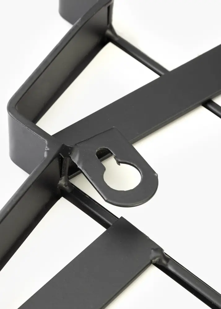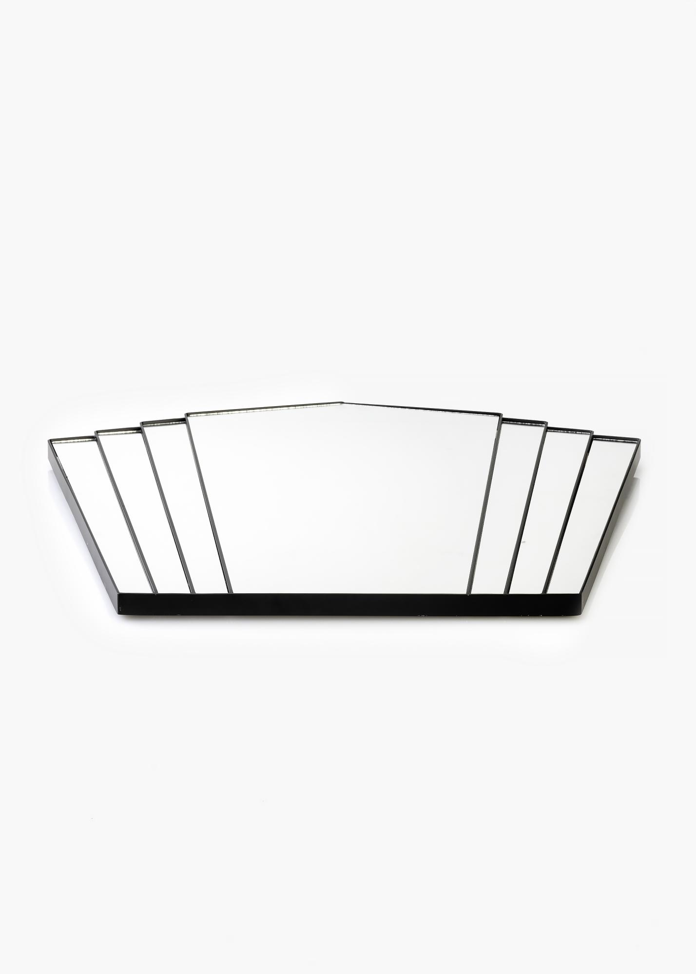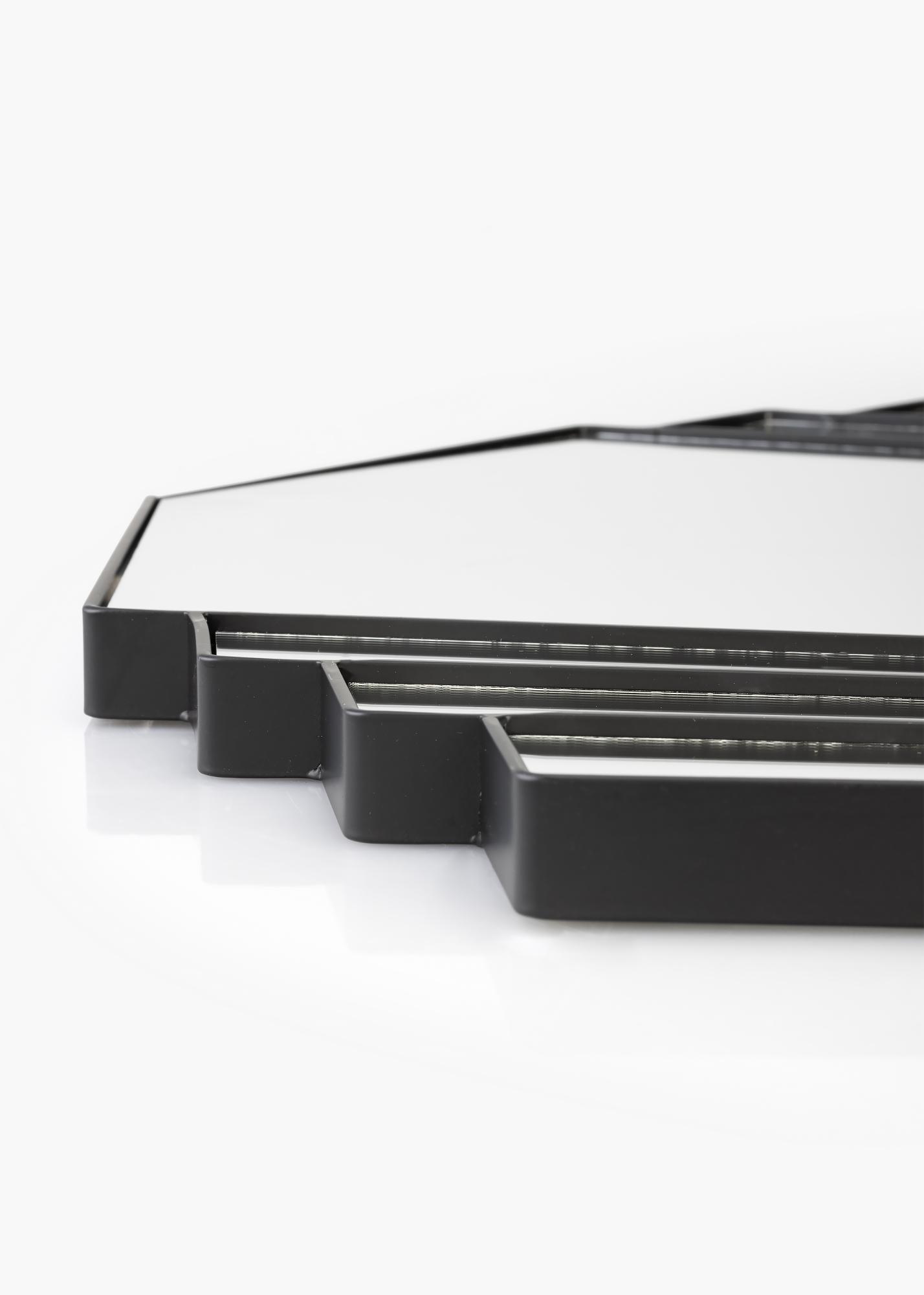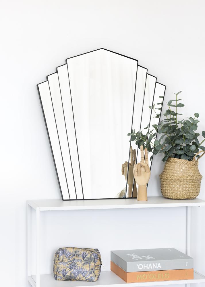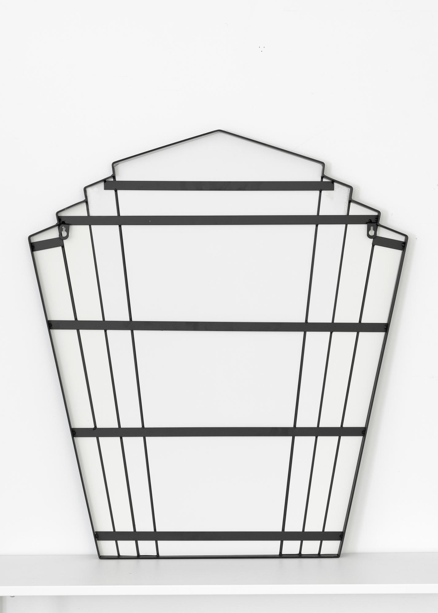 Dit is een wandspiegel in uniek en stoer design van KAILA. De spiegel heeft een ontwerp waardoor het bijna lijkt alsof er meerdere spiegels achter elkaar zitten. De verschillende secties zijn stijlvol omlijst door zwarte metalen randen die de spiegel een industrieel gevoel geven. De spiegel meet 63x70,5 cm. Wandbeugel aanwezig.
