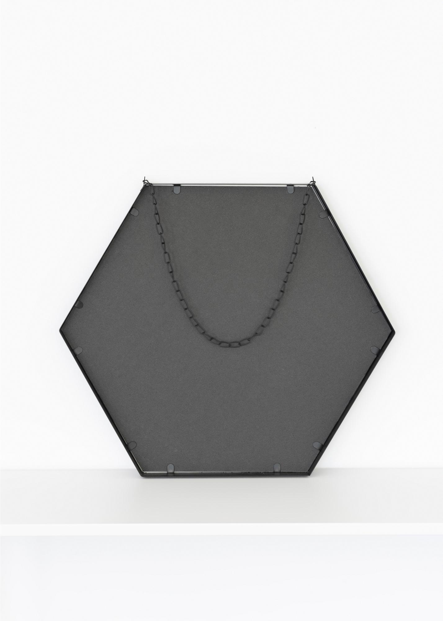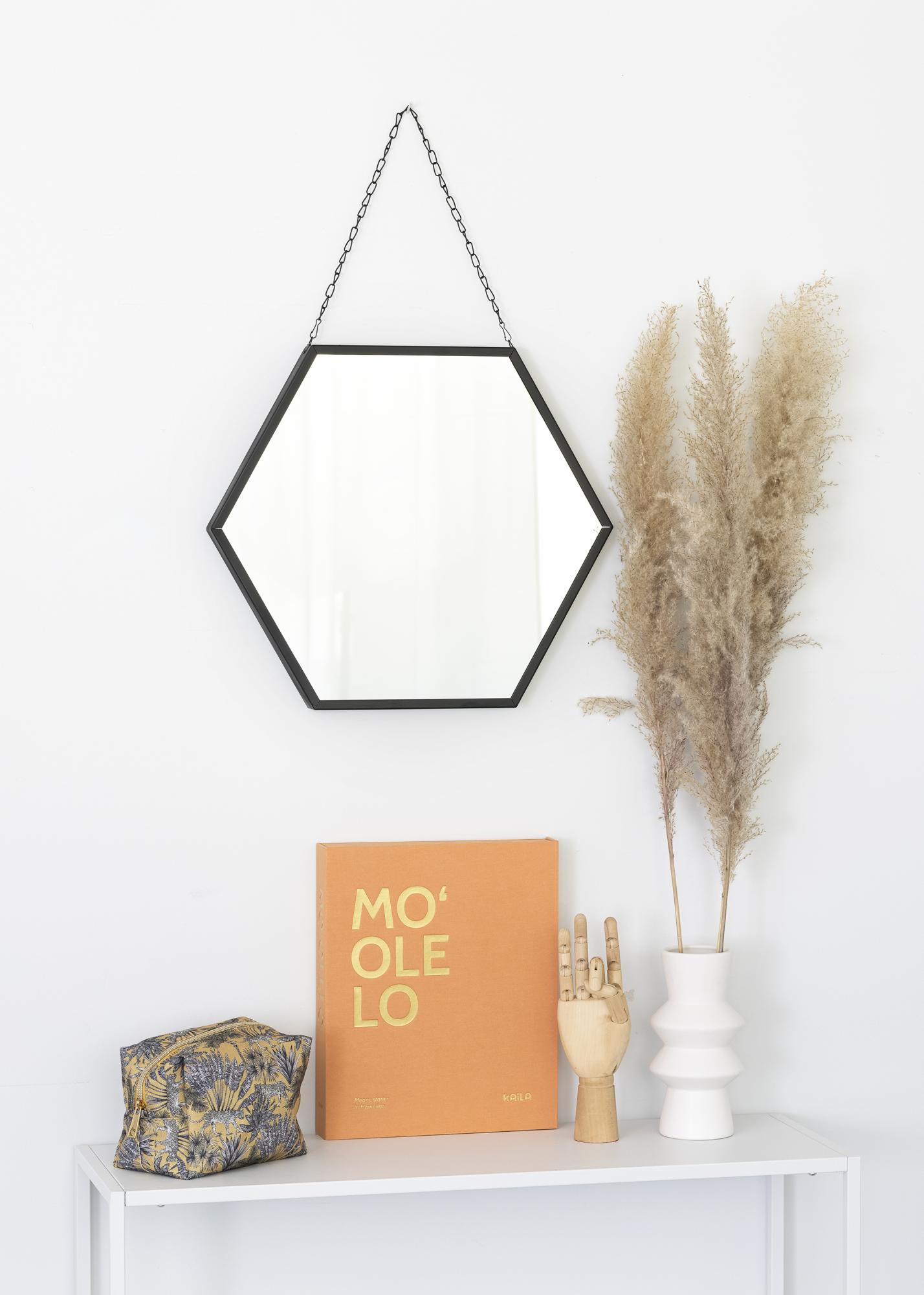 Dit is een stijlvolle zeshoekige wandspiegel met een decoratieve ketting om het geheel op te hangen. De spiegel meet 39x45 cm en is gemaakt van metaal. Deze spiegel past bijzonder goed in het moderne huis met zijn hoekig ontwerp en zwarte kleur.