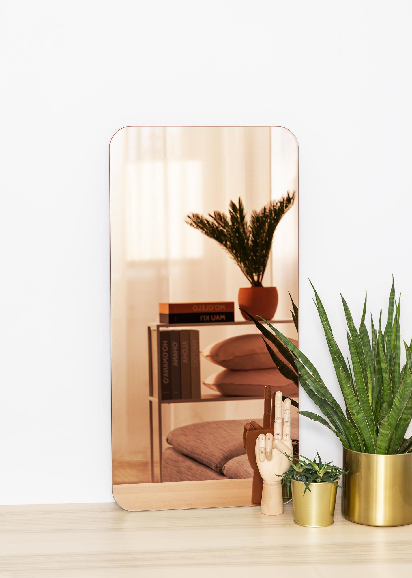 Deze rechthoekige spiegel is voorzien van decoratieve, afgeronde hoeken. Dit detail zorgt ervoor dat de totaalindruk van de spiegel onmiddellijk wordt verzacht en zorgt voor een elegante uitstraling. Bovendien heeft de spiegel roségoud getint spiegelglas, wat hem zeer opvallend en modern maakt. Overige details die het trendy gevoel van de spiegel versterken, is dat de spiegel geen lijst heeft en slechts 4 mm dun is. Hierdoor is het een functionele wandspiegel en een trendy interieurdetail in een!