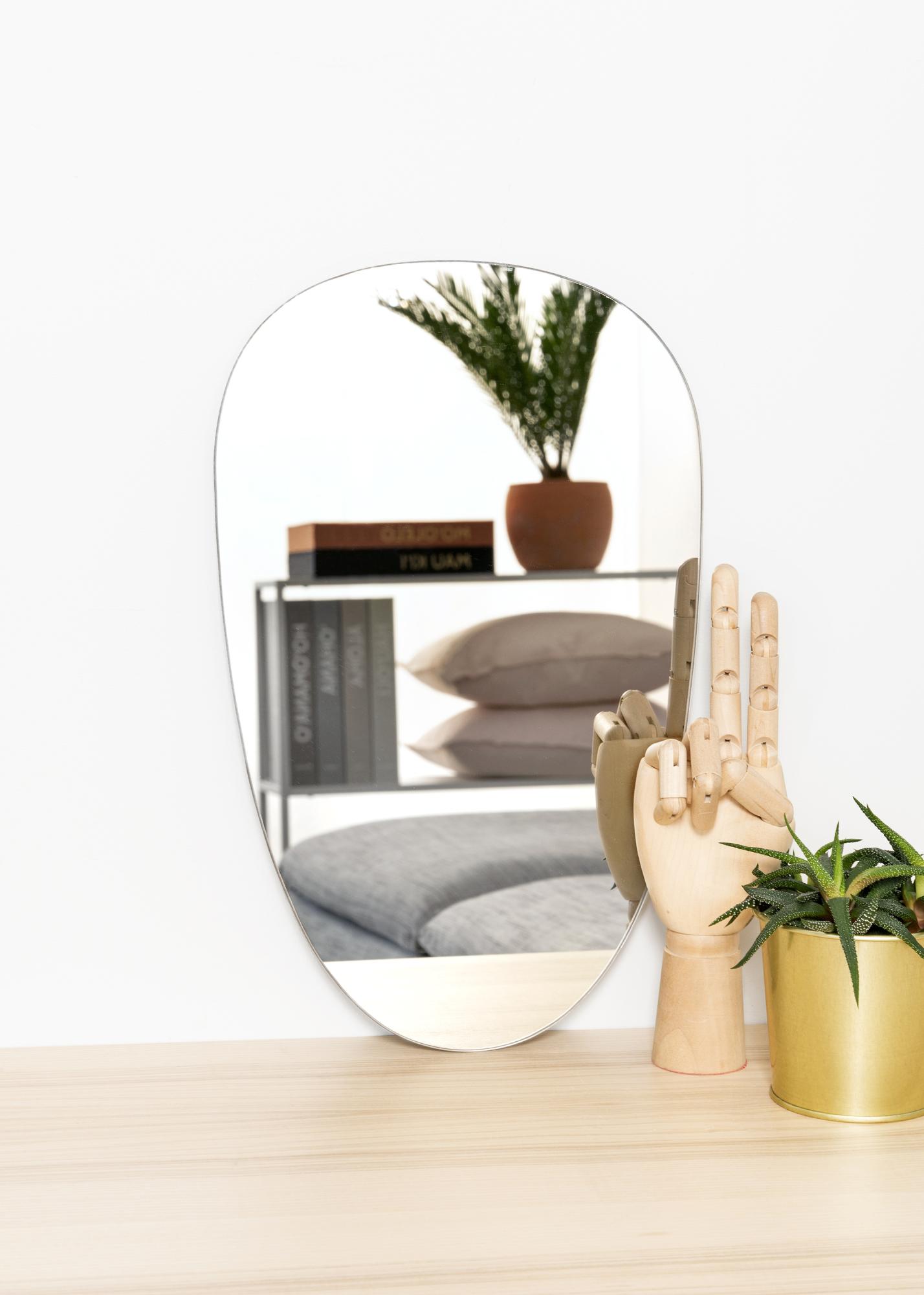 Een spiegel met een spannende en aparte vorm zorgt voor een trendy indruk in huis! Deze asymmetrische spiegel is boven slechts 4 mm dun en heeft geen lijst, wat voor een zeer slank en elegant uiterlijk zorgt.