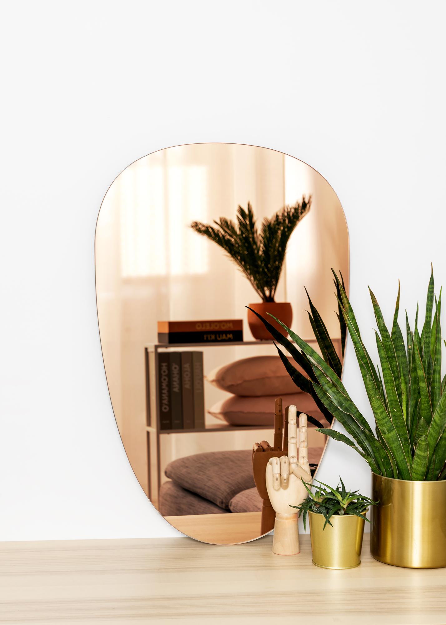 Voeg functionaliteit en een vleugje stijlvol, Scandinavisch design toe aan je interieur! Met deze spiegel - en zijn zachte en elegante vorm - creëer je een uitnodigende en gemoedelijke sfeer in huis. De spiegel is asymmetrisch ovaal, zeer dun en heeft geen lijst, wat bijdraagt aan de slanke en stijlvolle uitstraling. De spiegel heeft bovendien roségoud getint spiegelglas, wat het tot een zeer trendy interieurdetail maakt voor in je huis.