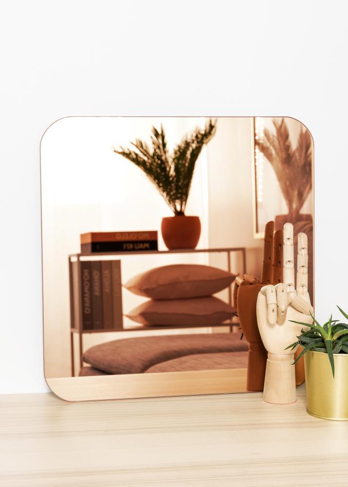 Deze vierkante spiegel heeft decoratieve afgeronde hoeken die voor een zachte en elegante look zorgen. De spiegel is ook erg dun en heeft geen lijst, waardoor hij een erg trendy en minimalistische uitstraling krijgt. Bovendien is het spiegelglas getint en heeft het een warme, roségouden kleur, waardoor de spiegel een zeer stijlvol en modern interieurdetail in je woning zal zijn.