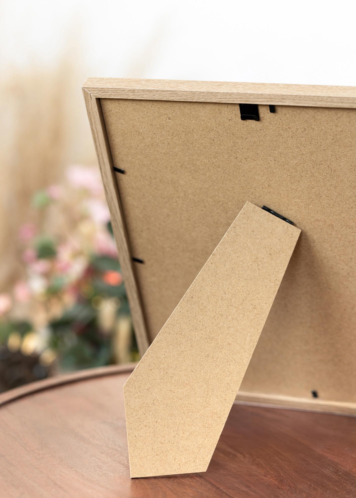 Dit kader is gemaakt van MDF-materiaal en heeft een stijlvol eikenkleurig oppervlak en echt glas. Het dunne profiel van slechts 14 mm geeft een elegante indruk. De achterkant wordt op zijn plaats gehouden door buigbare pinnen en is gemakkelijk los te maken wanneer je je afbeeldingen wilt monteren.