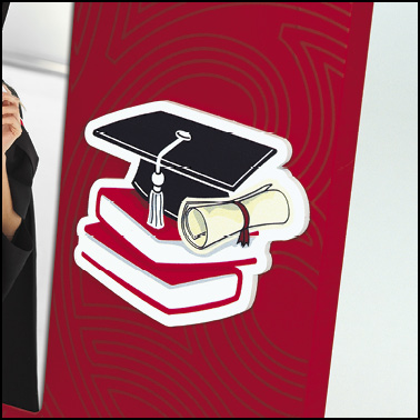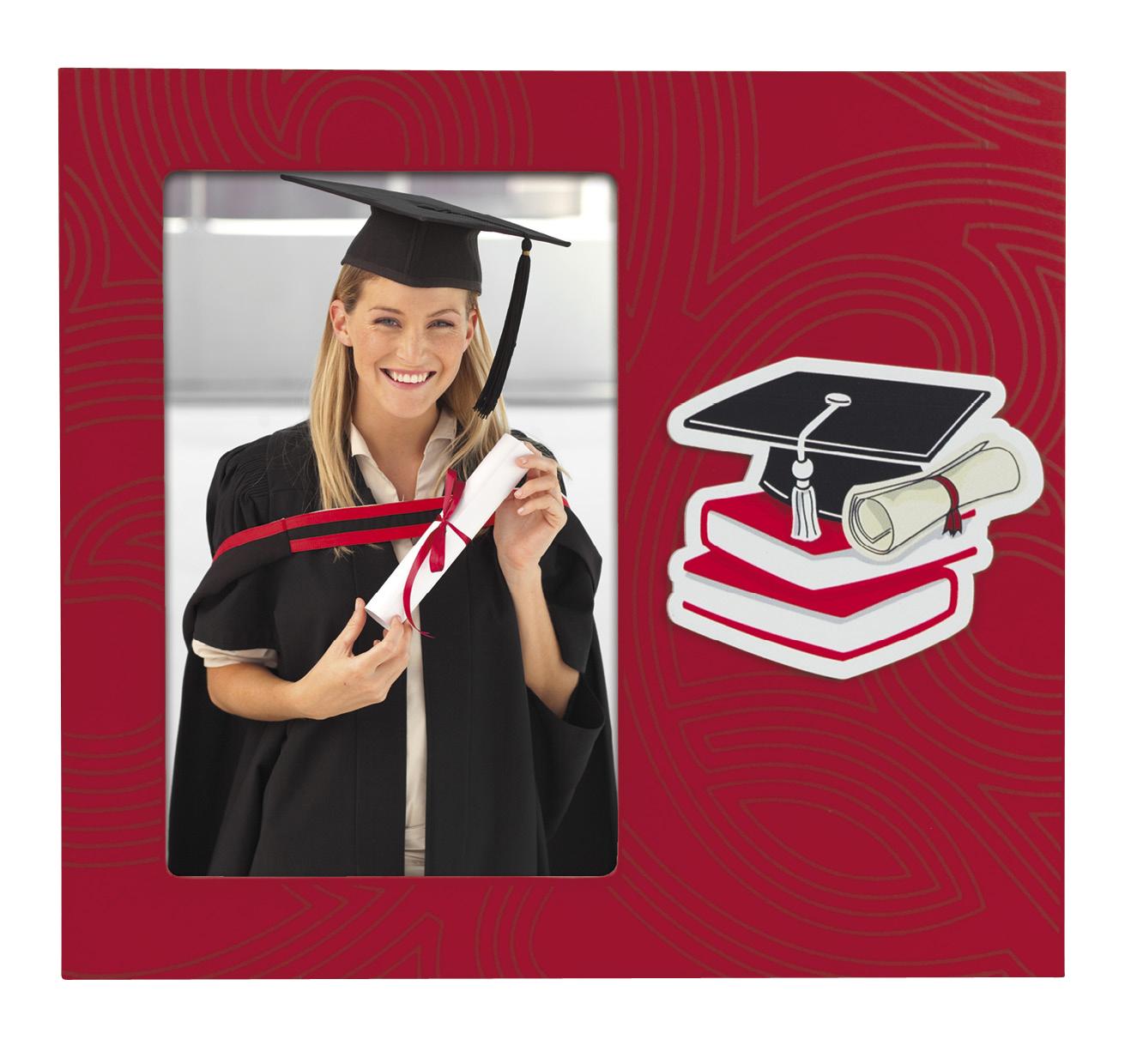 Laat een mooie foto van je examenuitreiking prijken in de boekenkast of op het bureau. Deze decoratieve lijst komt in rood met een discreet patroon en ruimte voor een foto van 10x15 cm. Naast de foto zit er een iets verhoogde afbeelding van een Amerikaanse afstudeerbaret en een diploma bovenop een stapel boeken.