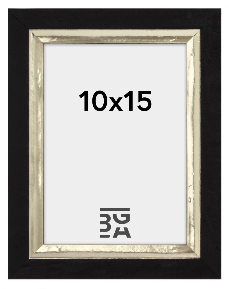 "Leonie" is een brede fotolijst. In Italië geproduceerd, dus gegarandeerd van goede kwaliteit en met een mooi design. De zwarte "kader heeft een elegant en bewerkt profiel met een brede zilveren rand langs de afbeelding.