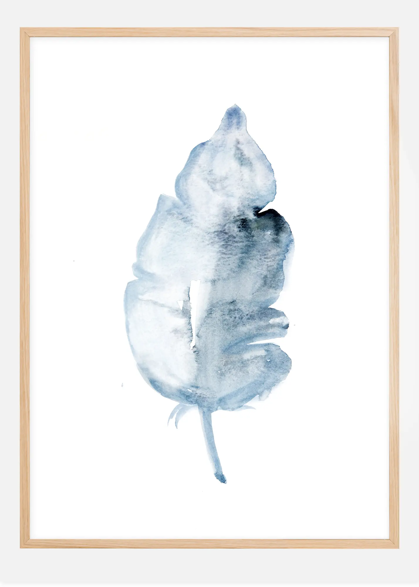 Een prachtige close-up poster van een grote lichtblauwe veer. Op een witte achtergrond reflecteert het licht op de linkerkant van de veer, waardoor het bijna transparant lijkt. Een minimalistische poster die perfect past in elke omgeving.