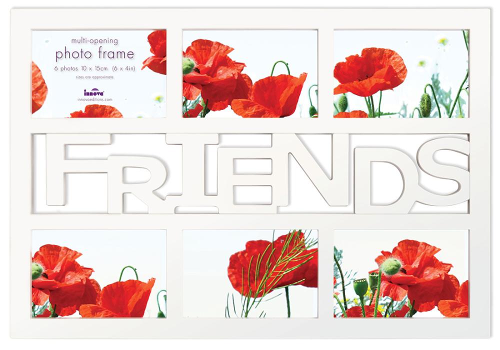 Een hele mooie witte collagelijst met de tekst "Friends" en ruimte voor 6 foto's van 10x15 cm. Je kunt direct aan de gang met het plaatsen van prachtige herinneringen aan je vrienden.