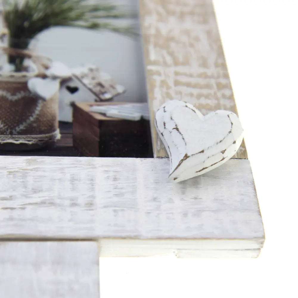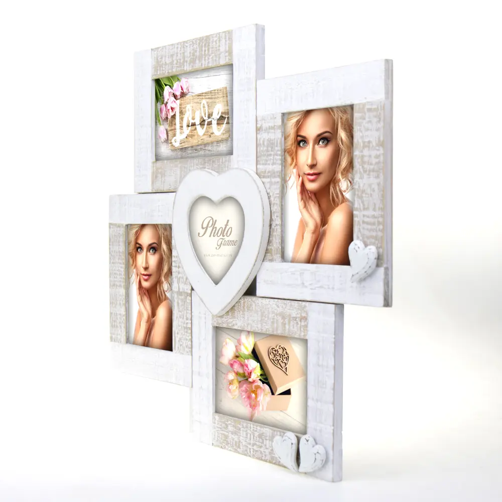 Dit is een mooi collagekader in romantisch design met decoratieve hartjes. Het multi kader is gemaakt van hout en heeft een mooie klassieke witte kleur. Dit kader heeft ruimte voor 4 afbeeldingen in 10x15 cm en 1 kleinere afbeelding in 10x10 cm. De buitenafmetingen van het frame zijn 43x43 cm en heeft wandbevestiging.