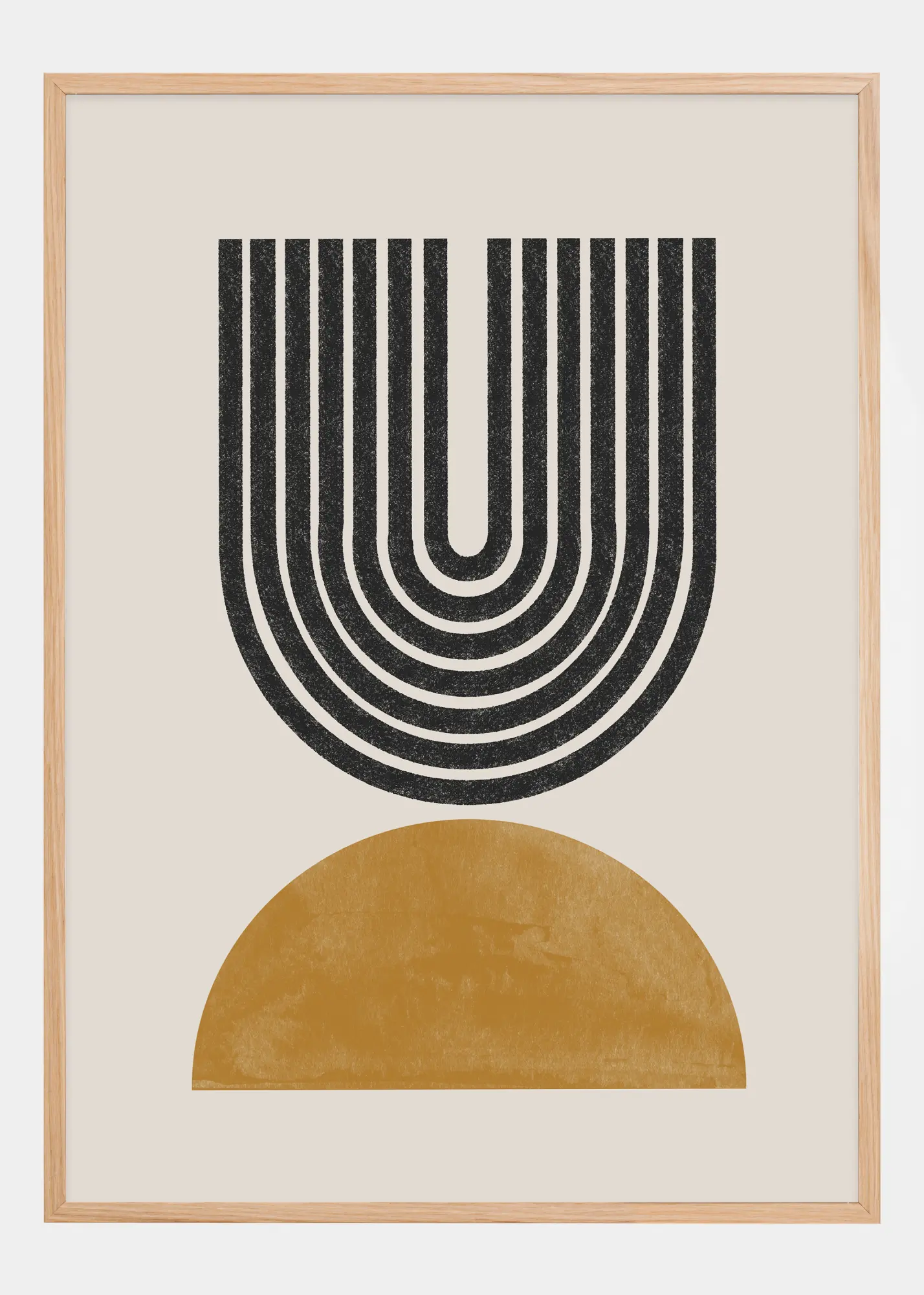 Onze nieuwste poster biedt een unieke mix van geometrische vormen en tinten die elkaar aanvullen in een tijdloze compositie. De afbeelding presenteert een indrukwekkend patroon van zwarte en witte bogen die een illusie van diepte en beweging creëren, rustend op een stevige halve maanvormige basis in een warme okerkleur. Deze print is geïnspireerd door mid-century modern design en voegt een onmiddellijke gevoel van stijl en verfijning toe aan je muur.