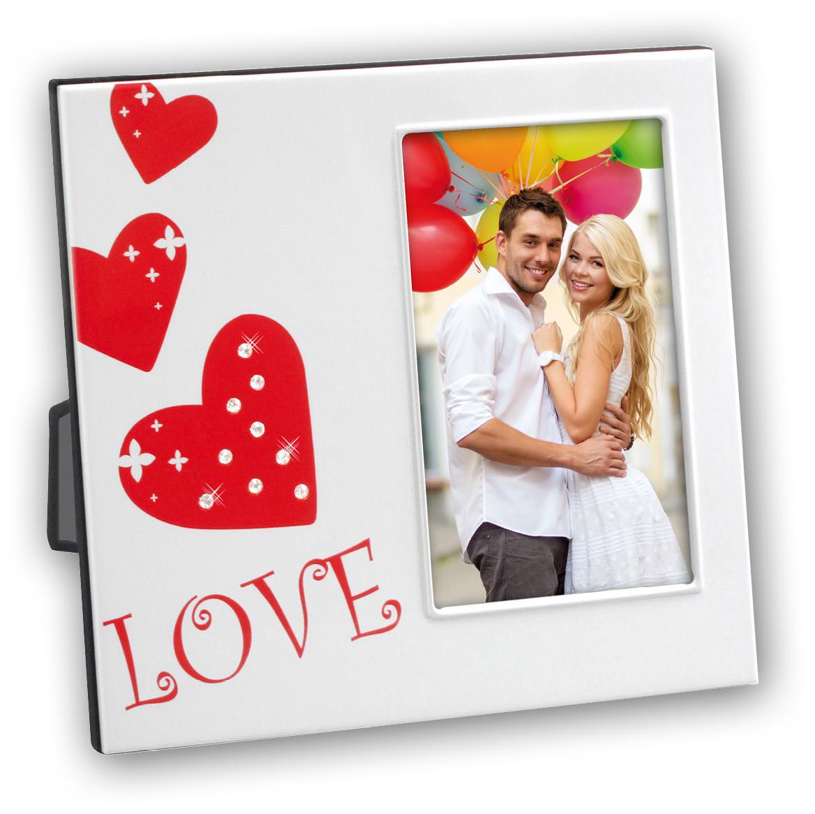 Fotolijst met rode harten, de tekst "Love" en ruimte voor een eigen foto van 10x15 cm. Een fotolijst die gegarandeerd het juiste gevoel geeft aan een van je favoriete foto's.
