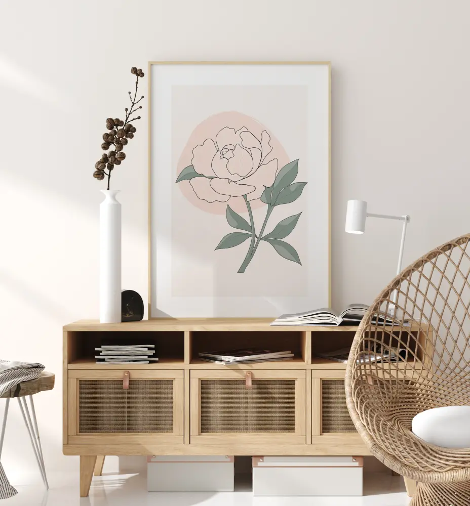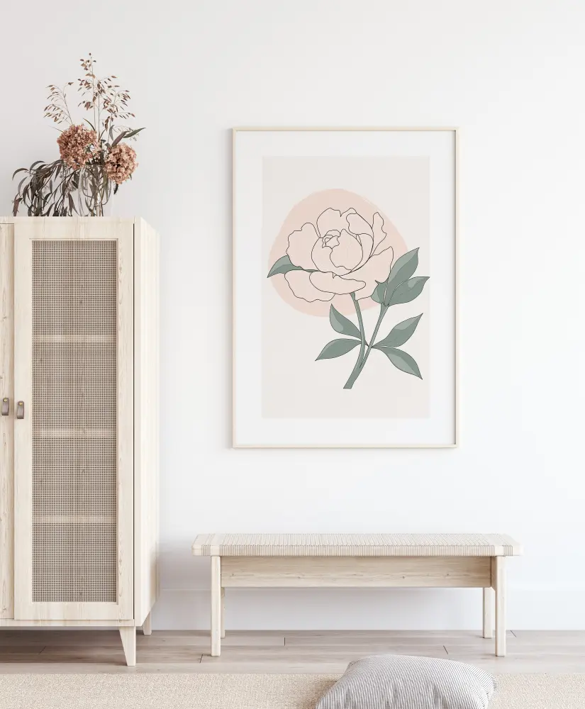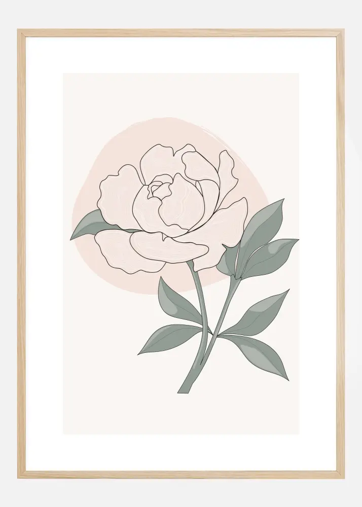 Een poster met een indruk van een kunstenaar van een pioenroosstengel met een roze bloem. Op een beige achtergrond staat de roze bloem op een perzikkleurige vorm, terwijl de bladeren in zwart zijn omlijnd. Breng deze poster met de verfijnheid van deze bloem in je huis.