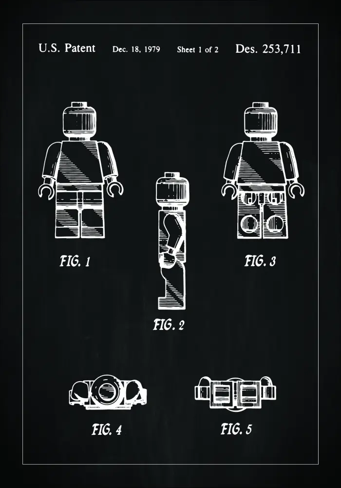 Deze patentposter beeldt de vindingrijkheid in speelgoedontwerp af, vertegenwoordigd door patent Des. 253,711 gedateerd 18 december 1979. De patenttekening toont een gesplitste constructie van een speelgoedfiguur van Lego, gepresenteerd in verschillende aanzichten: vooraanzicht, zijaanzicht en detailaanzichten van het hoofd en lichaam. De vijf figuren zijn genummerd en demonstreren het vermogen van het speelgoed om uit elkaar gehaald en weer in elkaar gezet te worden, een functie die een hele generatie van speelgoedontwerp heeft geïnspireerd.