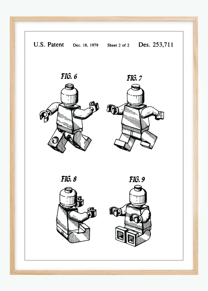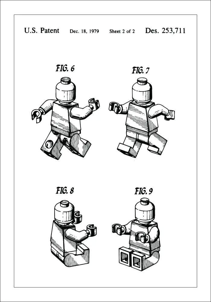 Deze patentposter beeldt een Legofiguur af, die werd geregistreerd bij het Amerikaanse octrooibureau op 18 december 1979 onder patentnummer Des. 253,711. De illustratie toont vier verschillende posities van de speelgoedfiguur, wat een dynamische en driedimensionale indruk geeft van het ontwerp en de functionaliteit ervan. Elke afbeelding toont de beweeglijkheid van de figuur en de verschillende houdingen die ze kan aannemen.