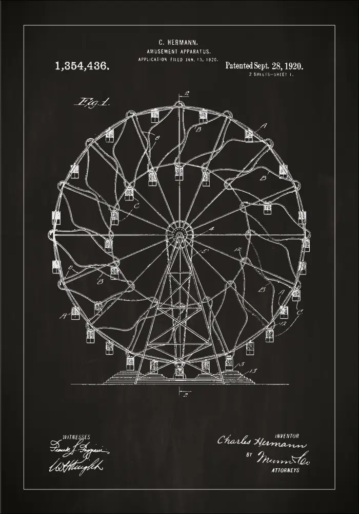 Deze patentposter presenteert C. Hermanns klassieke constructie van een pretpark, gespecificeerd in het patent met nummer 1,354,436, uitgegeven op 28 september 1920. Met zijn gedetailleerde weergave van een reuzenrad, symboliseert deze tekening een tijdperk van speelse innovatie en is het een fantastische decoratie-element voor iedereen die een hart heeft voor historisch vermaak en techniek. Het intrigerende ontwerp en de minutieuze details trekken de aandacht en geven een nostalgisch gevoel.