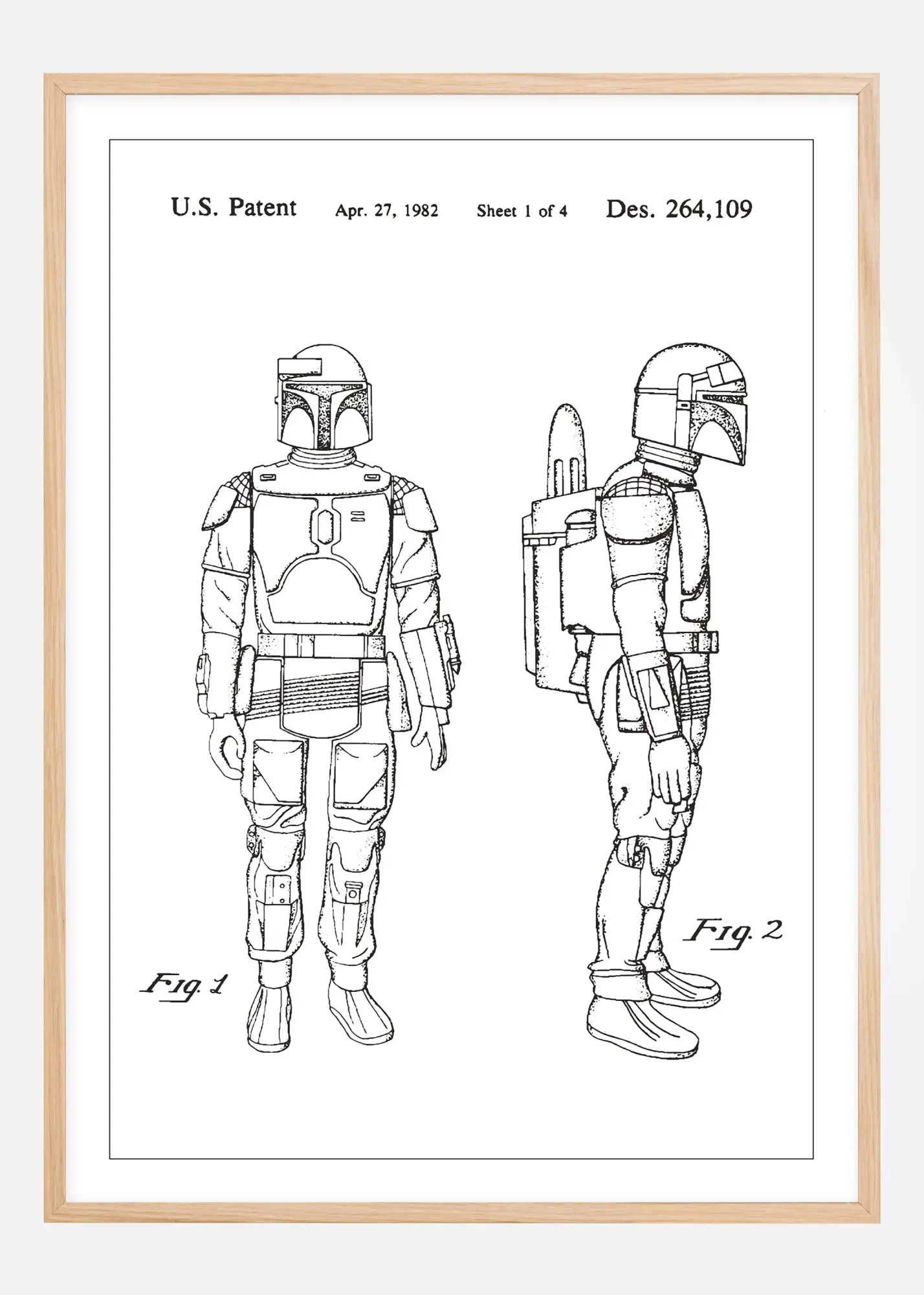 Imponeren met een stuk geschiedenis aan uw muur met deze verfijnde patentposter die een iconisch harnas van Boba Fett uit Star Wars afbeeldt. Ontworpen voor avonturen voorbij het alledaagse. Deze exacte reproductie van een Amerikaans patent, genummerd Des. 264,109 en gedateerd 27 april 1982, is een eerbetoon aan tijdloze innovatie en ontwerpgenialiteit. Ideaal om een artistieke en industriële sfeer te geven aan het kantoor of de huisbibliotheek, en het moedigt een omgeving aan gevuld met inspiratie en creativiteit.