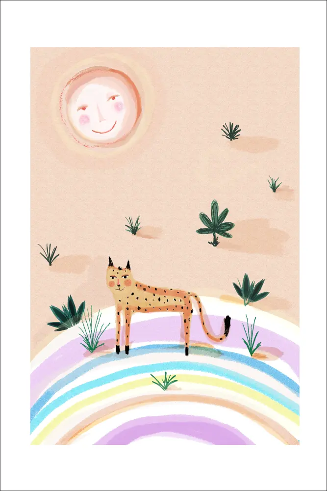 Een leuke woestijn poster van een luipaard en de zon die allebei glimlachen. Op een veelkleurig oppervlak is het kleine, dunne luipaard omgeven door kleine woestijnplanten. Een ideale poster om in de slaapkamer van je kind te hangen om een vrolijke sfeer te creëren.