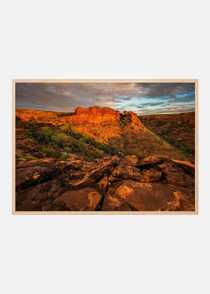 Affiche met een foto van barre rode bergen bij zonsondergang, iets voor degenen die van woestijnen en rotsformaties houden om aan de muur te hangen. De warme rode tinten tegen de ijsblauwe hemel en de diepte in de afbeelding creëren een interessant motief. Lijst de poster in met een stijlvolle fotolijst en plaats het op een muur met andere woestijnmotieven.