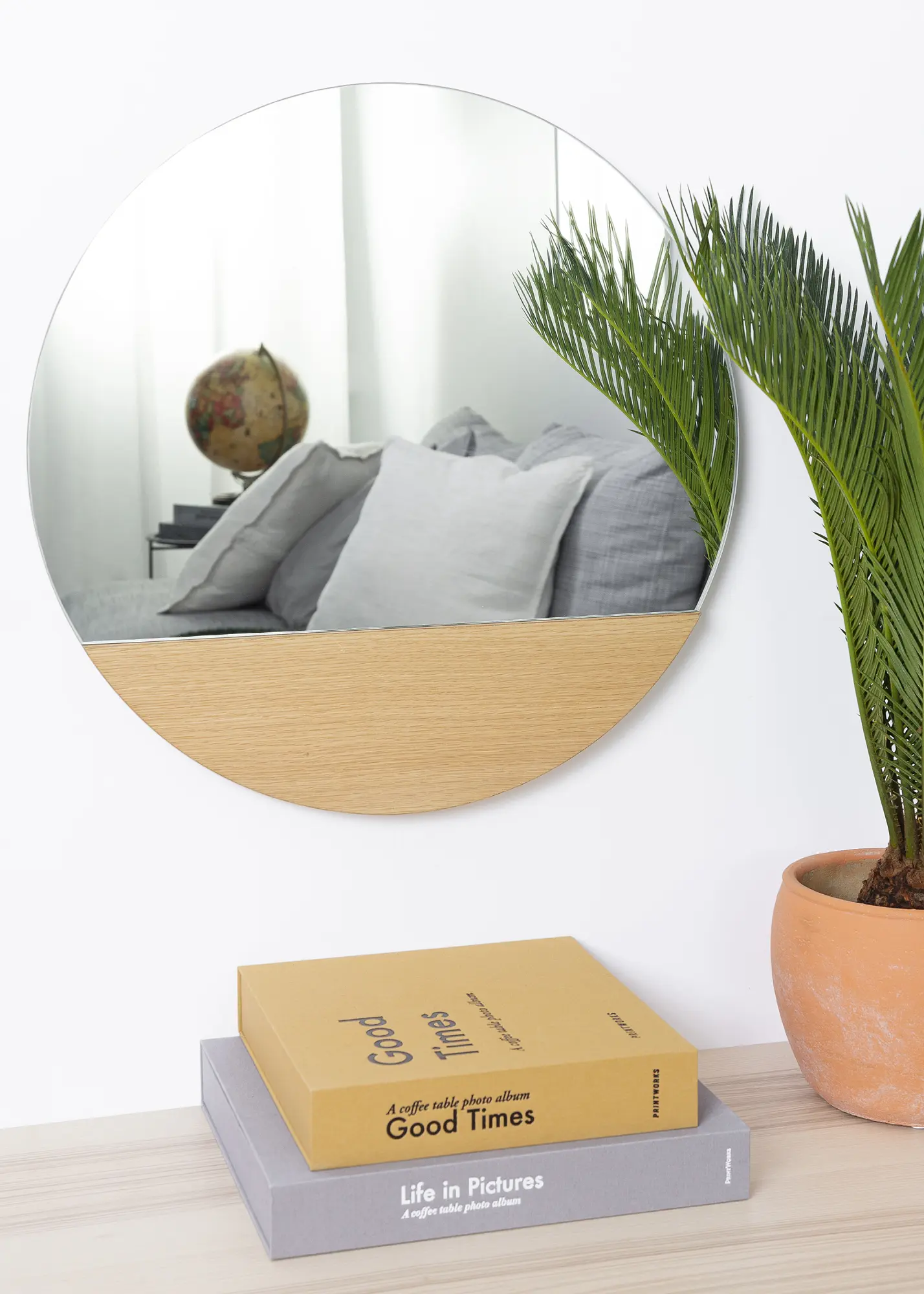 Deze ronde wandspiegel heeft een simpele maar ook decoratieve details aan de onderkant van de spiegel waar het is voorzien met eikenhout. Deze simpele detail maakt de spiegel zo veel meer interessant!