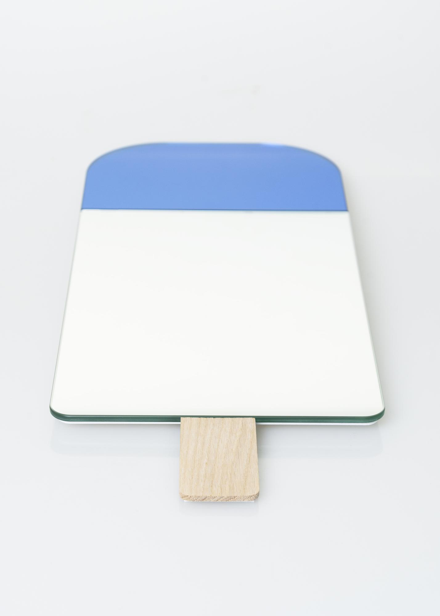 De ijsvormige spiegel is ontworpen door Tor & Nicole Vitner Servé van het Deense Elements Optimal (EO). De gekleurde top is verkrijgbaar in verschillende maten waarvan deze variant de kleur Ocean Blue heeft.
