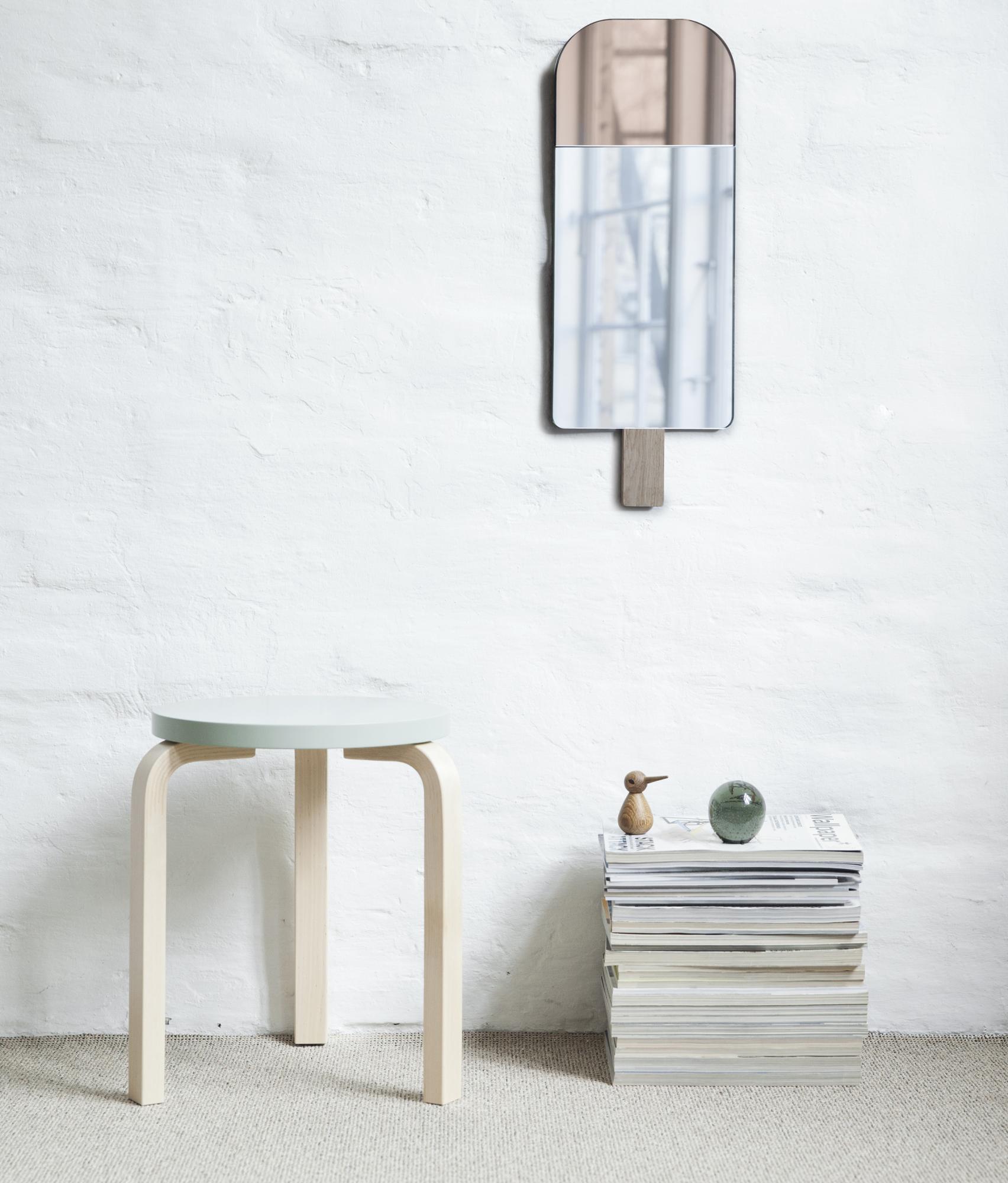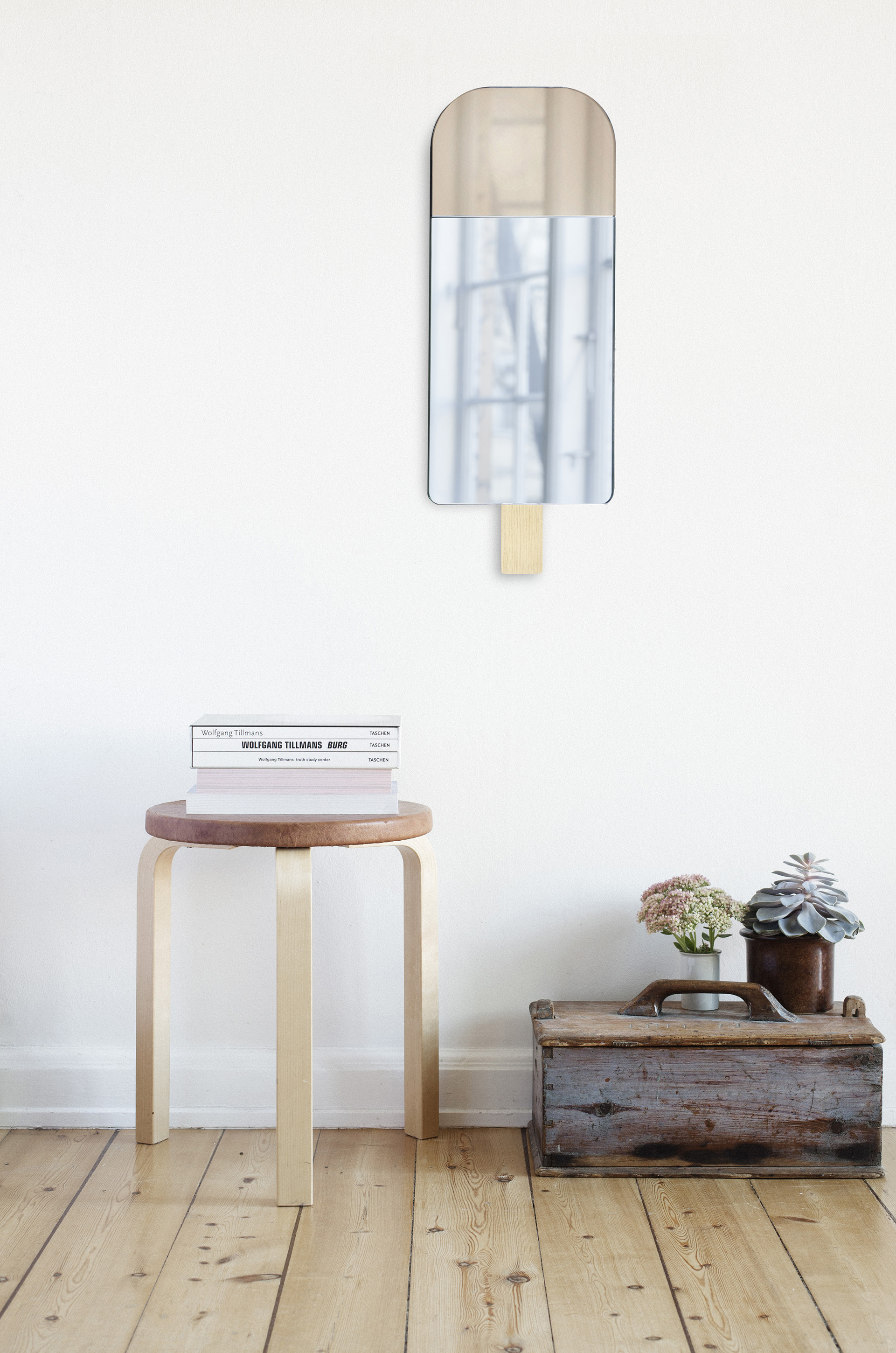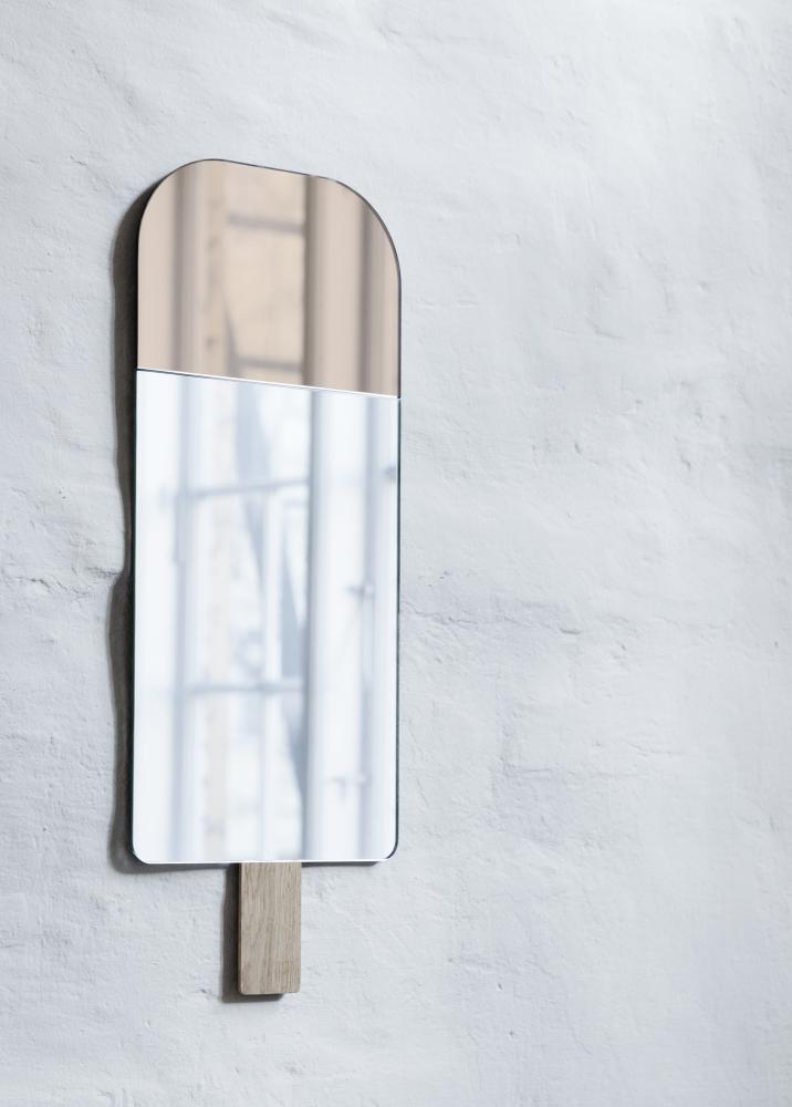 De spiegel is voorzien met hoog kwalitatief spiegelglas en het houten stokje in het onderste deel van de spiegel is gemaakt van onbehandeld eikenhout. Zoals vele andere ijsstokjes heeft deze spiegel natuurlijk een gekleurde top.