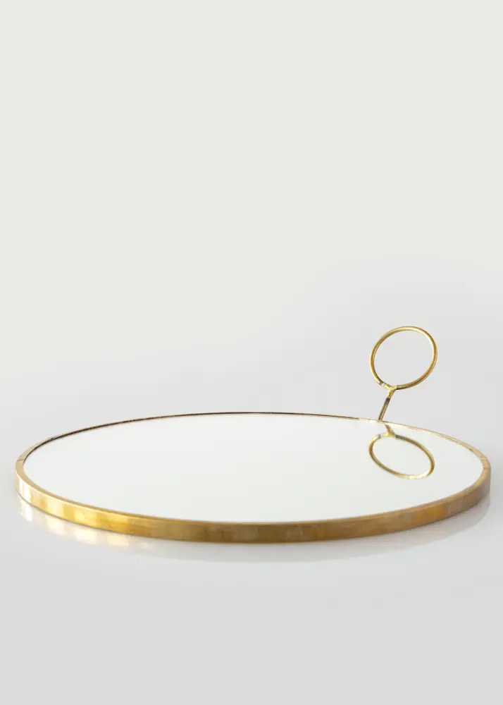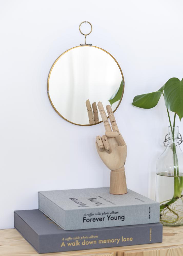 Deze ronde spiegel heeft een stijlvol en zeer functioneel design. Rondom de spiegel loopt een dunne rand, gekleurd in elegant messing. En de bovenkant van de spiegel is voorzien van een kleine cirkel die - naast een decoratief detail - ook eenvoudige en praktische ophanging mogelijk maakt.
