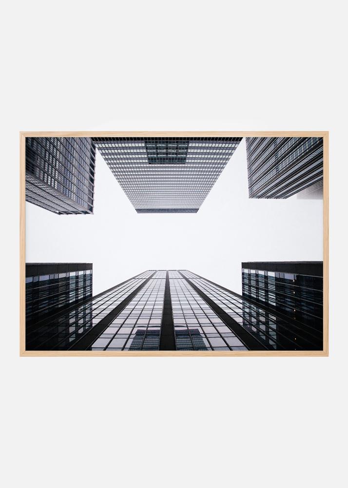Architectuurposters met groeiende wolkenkrabbers tegen een wolkenwitte hemel. Strakke afbeelding van donkere gebouwen tegen een witte achtergrond, met reflecties van de hemel in de glazen ruiten. Perfect cadeau voor wie van grafische gebouwportretten houdt. De print komt goed tot zijn recht in een zwarte lijst die het donkere in de afbeelding versterkt en wordt mooi in combinatie met andere fotografieën van architectuur.