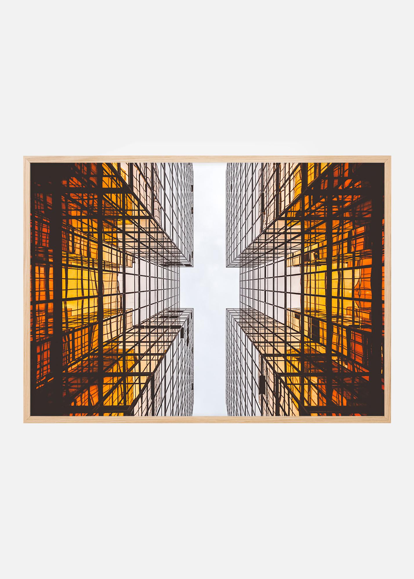 Affiche met futuristische architectuur die met zijn grafische lijnen een spannend patroon creëert. De kleuren vervagen van diep oranje aan de basis van het gebouw naar de witte hemel. De poster past goed in een dunne lijst, zowel in minimalistische interieurs als in andere stijlen met grafische elementen. Combineer het gerust met andere posters van spannende architectuur of stedelijke omgevingen.