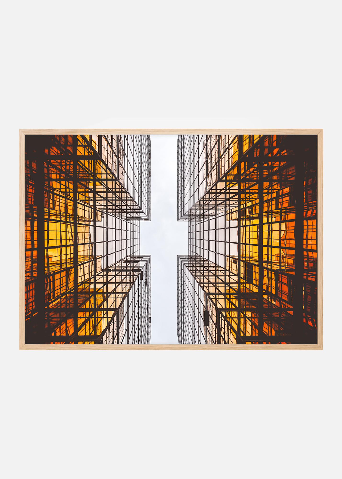 Poster met futuristische architectuur die met zijn grafische lijnen een spannend patroon creëert. De kleuren vervagen van diep oranje aan de basis van het gebouw naar de witte hemel. De poster past goed in een dunne lijst, zowel in minimalistische interieurs als in andere stijlen met grafische elementen. Combineer het gerust met andere posters van spannende architectuur of stedelijke omgevingen.