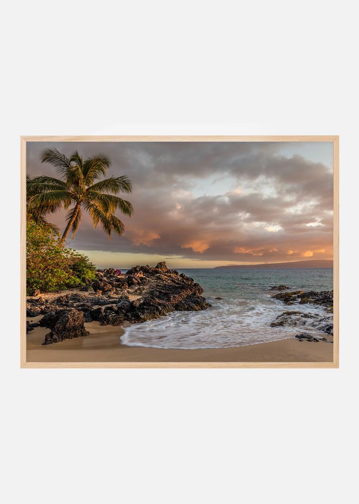 Een strand bij zonsondergang, een prachtig cliché dat een must is voor de tikifanaat of het tropische thema. Posters met de klassieke palmboom die uitsteekt over de rand van het strand in de laatste gouden zonnestralen van de dag. De foto staat mooi in een fotolijst met een verweerd uiterlijk of in een felle kleur om bij het tiki-interieur te passen.