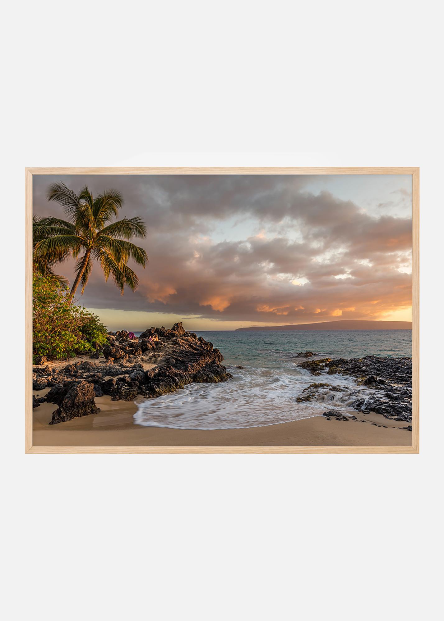 Een strand bij zonsondergang, een prachtig cliché dat een must is voor de tikifanaat of het tropische thema. Posters met de klassieke palmboom die uitsteekt over de rand van het strand in de laatste gouden zonnestralen van de dag. De foto staat mooi in een fotolijst met een verweerd uiterlijk of in een felle kleur om bij het tiki-interieur te passen.