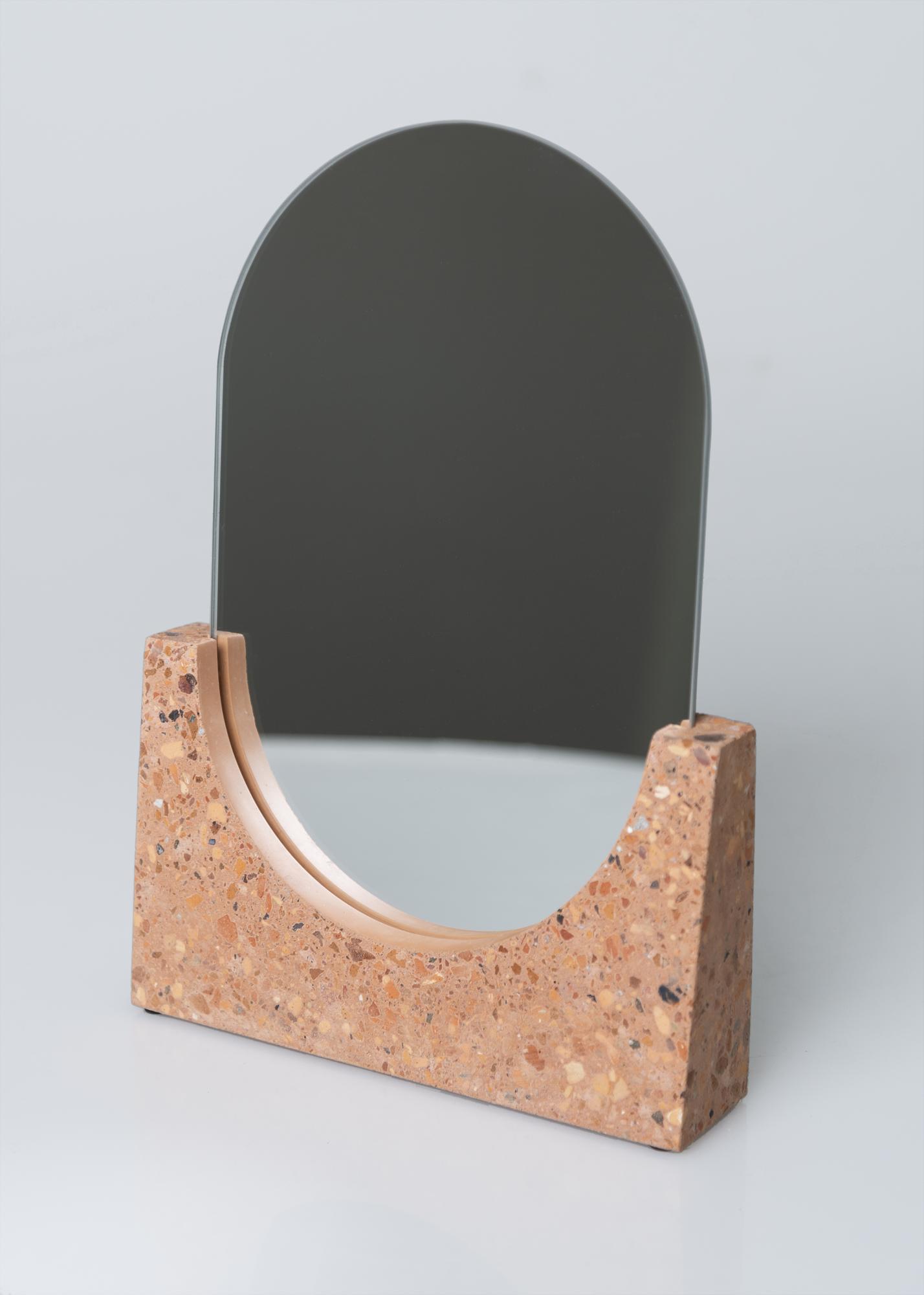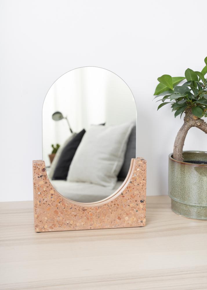 Deze tafelspiegel komt van het Deense Hübsch en is echt iets uniek. De zachte ovale vorm in combinatie met het prachtige steun van rood Terrazzo (kunststeen) maakt deze tafelspiegel opvallend en uitnodigend.