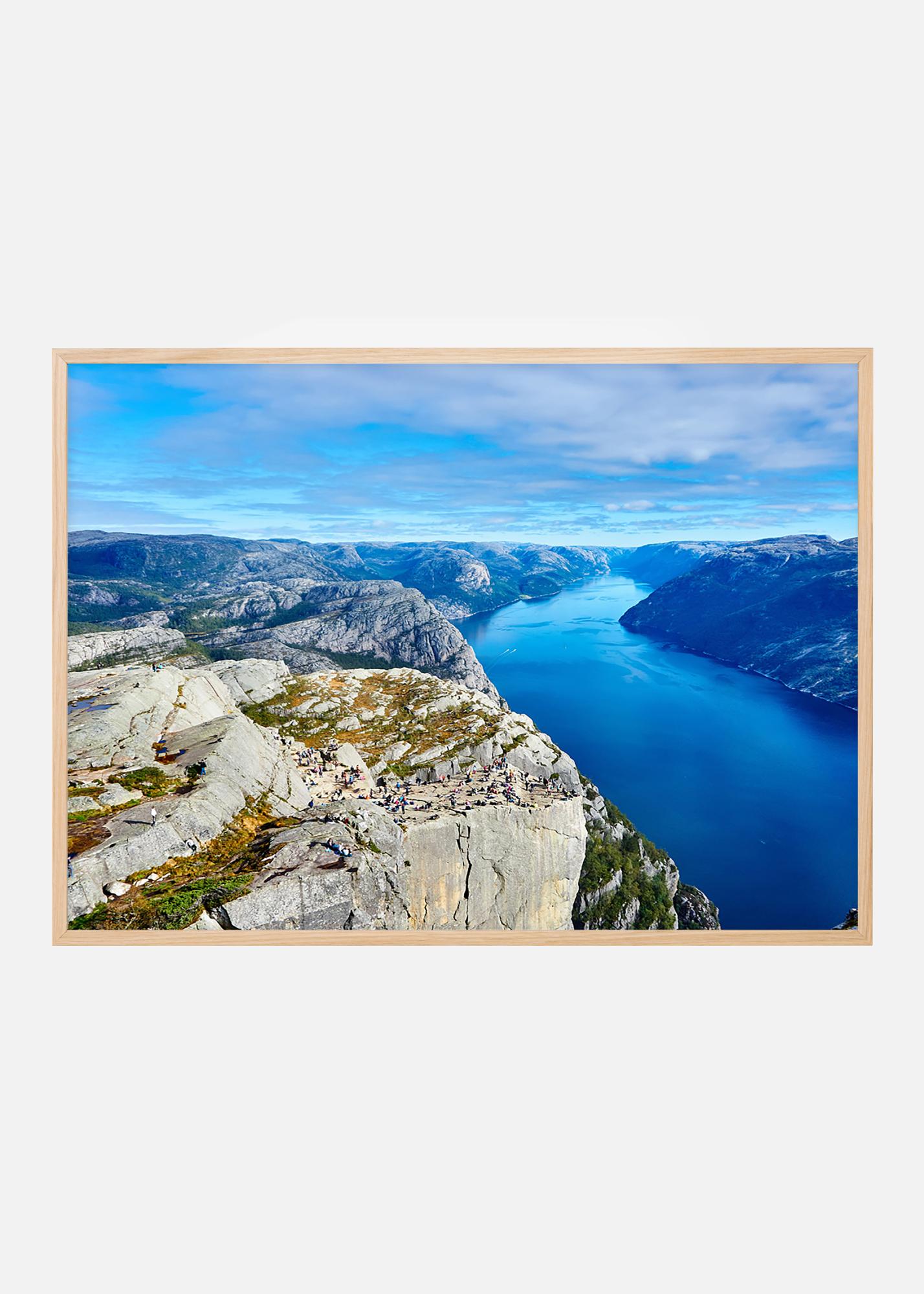 Fotografie met een adembenemend uitzicht over een diepe fjordvallei. De poster heeft zeetinten met door de zon verlichte kale rotsen aan beide zijden van de fjord, een indrukwekkend landschap dat past aan de muur van iemand die een mooi natuurscenario waardeert. Complementeer de afbeelding met een lijst die het motief benadrukt.